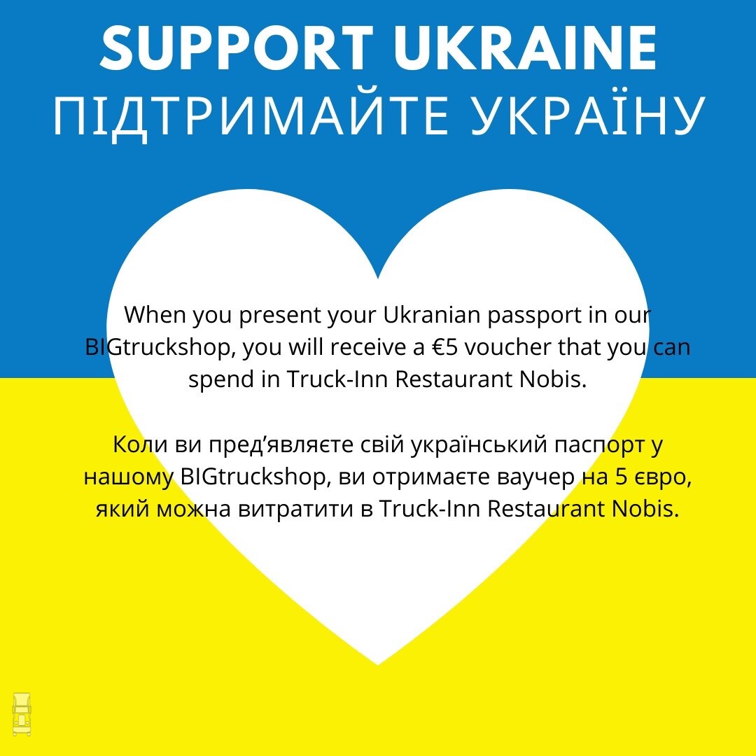 Om onze chauffeurs uit Oekraïne te steunen, kunnen zij vanaf vandaag op vertoon van hun Oekraïense paspoort een voucher van €5 voor Truck-Inn Restaurant Nobis in onze BIGtruckshop op komen halen.