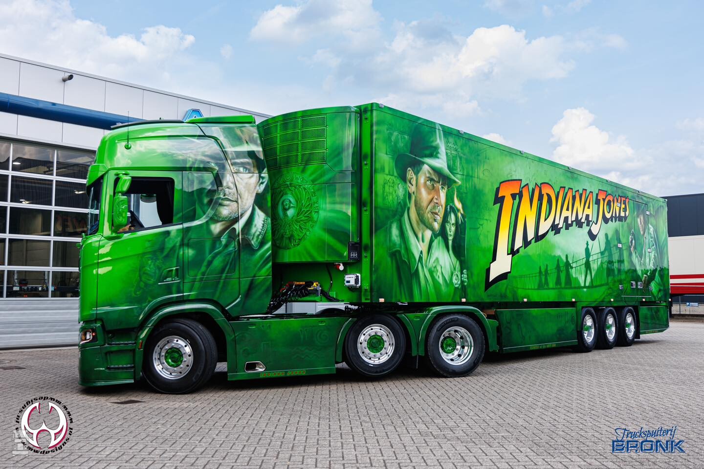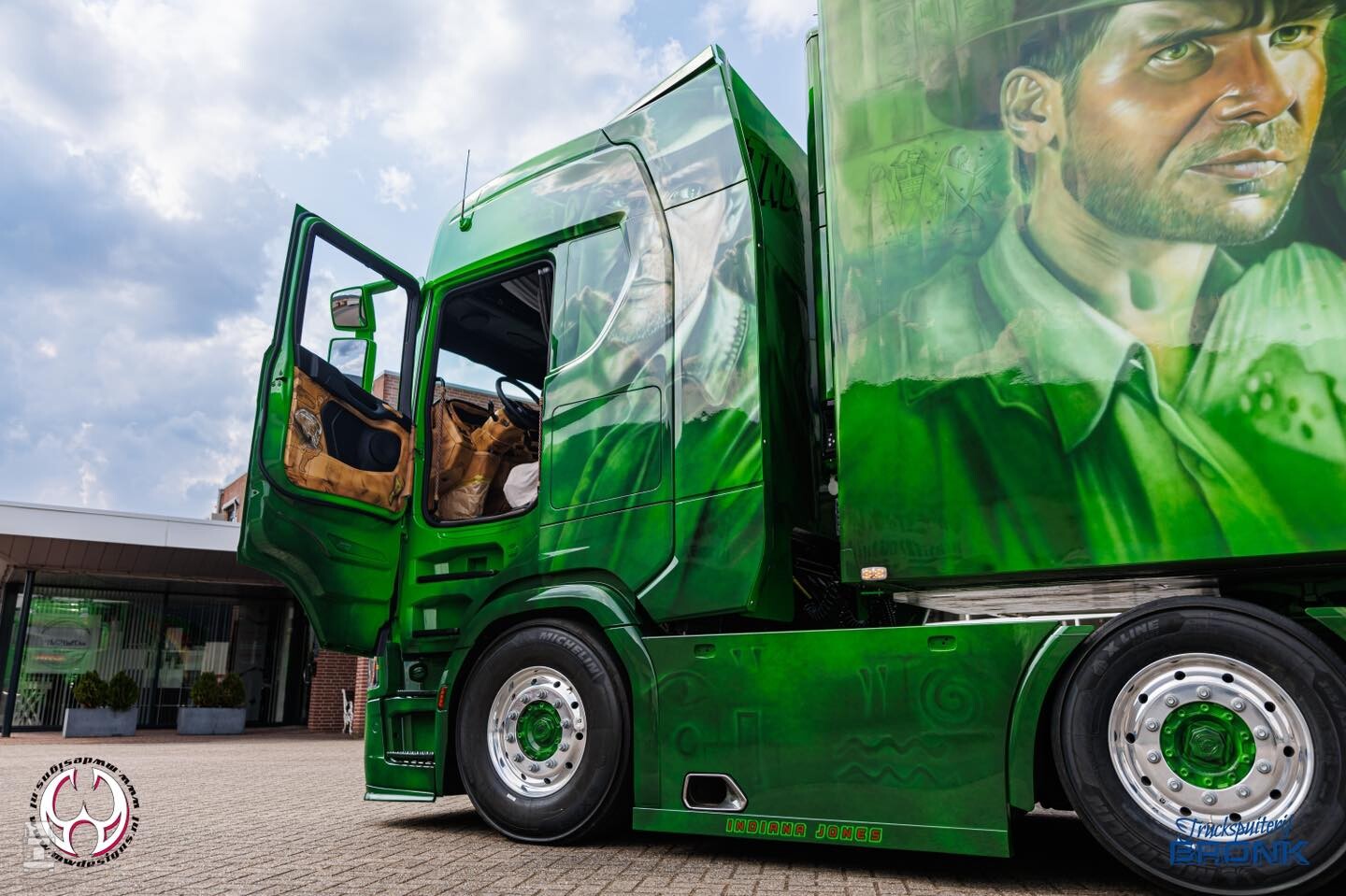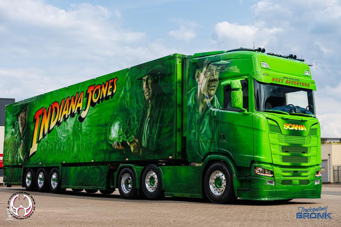 De nieuwe Scania 660S Highline met oplegger werd compleet voorzien van special paint in het thema van Indiana Jones. De aandacht voor details is fantastisch in het airbrush werk van MWDesigns. De basiskleur en de blanke lak werden verzorgd door Truckspuiterij Bronk. De combinatie is niet te missen met zijn felle kleuren en zal aankomend weekend te zien zijn in Assen. De foto's spreken voor zich zelf!