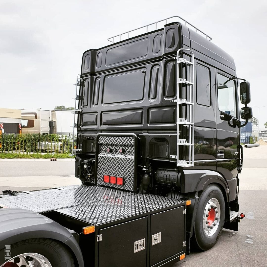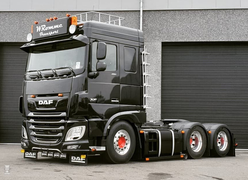 Verder werd het chassis dicht gemaakt met traanplaat en werd er een speciale achterbumper gemonteerd. Op het dak staat een indrukwekkende lichtbak, vlak boven de 'Engelse' zonneklep. Extra verlichting onder de bumper, op het dak en rondom maken het plaatje af. Opvallend is dat er gekozen is voor één kleur, namelijk zwart. Afgezien van de rode wielnaven is alles ingetogen gehouden voor wat betreft kleuren en dat oogt toch heel strak. Alles bij elkaar is het een indrukwekkende truck geworden, deze nieuwe DAF XF van Wesley Romme.
