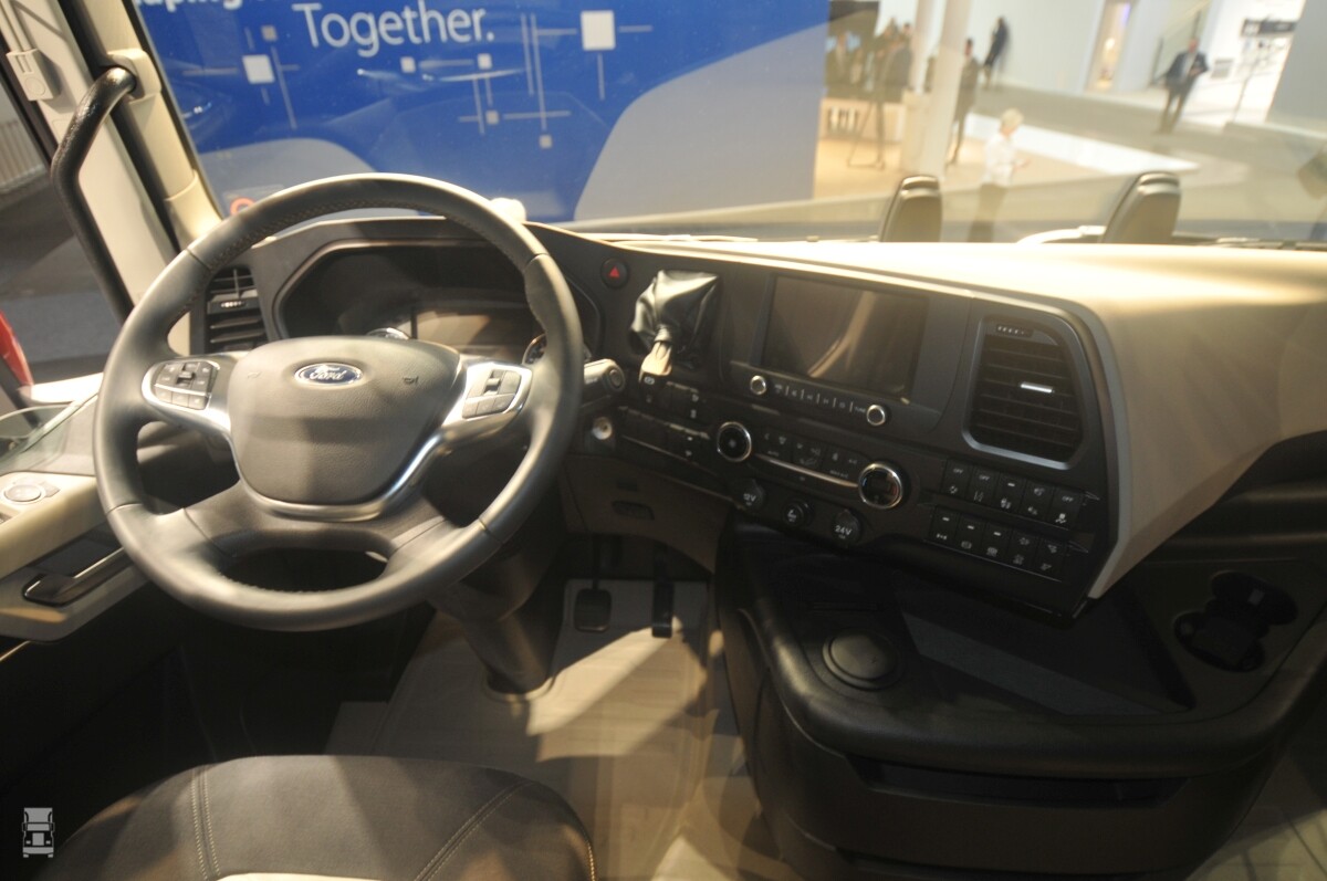 Dus de volgende ochtend gauw terug naar de stand en gelukkig, de trucks stonden niet op slot. Wat we zien is een bedrijfswageninterieur dat volledig is geïnspireerd op de personenwagens van Ford. Dit is zeker niet erg, maar verder is de het interieur niet verrassend. Functioneel zouden we willen zeggen, en het is bijna aandoenlijk om weer eens een handremhandle op een dashboard te zien.
