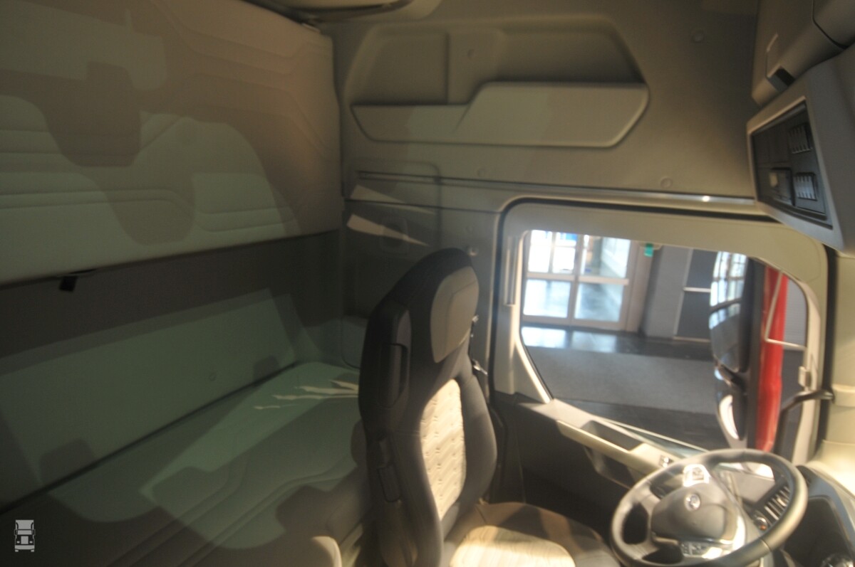 Het bovenste bed was opgeklapt, onder het onderste bed bevindt zich een bescheiden koelkast. In de middenconsole zien we lades die we van MAN kennen. De spiegelhuizen zijn eigenlijk te groot, de stoelen geven voldoende support. Zeker nu we net de nieuwe Actros hebben gezien, valt het op dat de Ford nog veel knopjes op de middenconsole heeft. En van buiten mag de F-Max dan veel van de Volvo FH hebben, van binnen zeker niet!