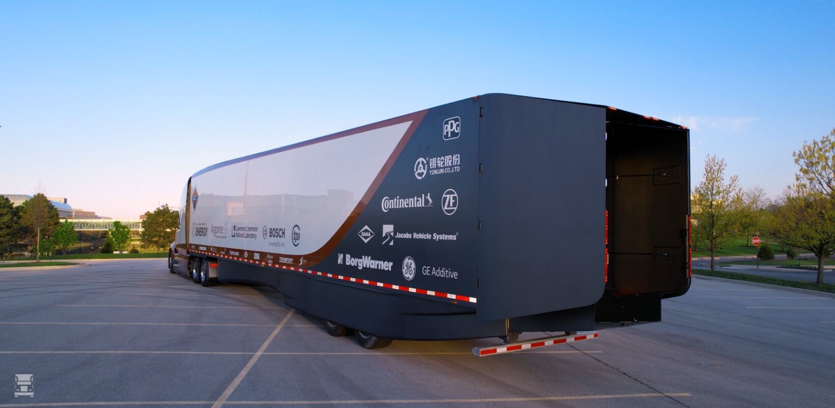 Daarnaast scheelt de ver doorgevoerde aerodynamica veel brandstof. De carrosserie is heel glad. Spiegels zijn vervangen door camera’s en het gat tussen trekker en trailer is heel klein. De zijkant van de trailer is dichtgemaakt voor een betere luchtstroming, net zoals de onderkant van de combinatie. Aan de achterkant van de trailers zitten lange spoilers, die je in Amerika op de weg soms al tegenkomt. Tijdens het rijden wordt ook de rijhoogte aangepast.