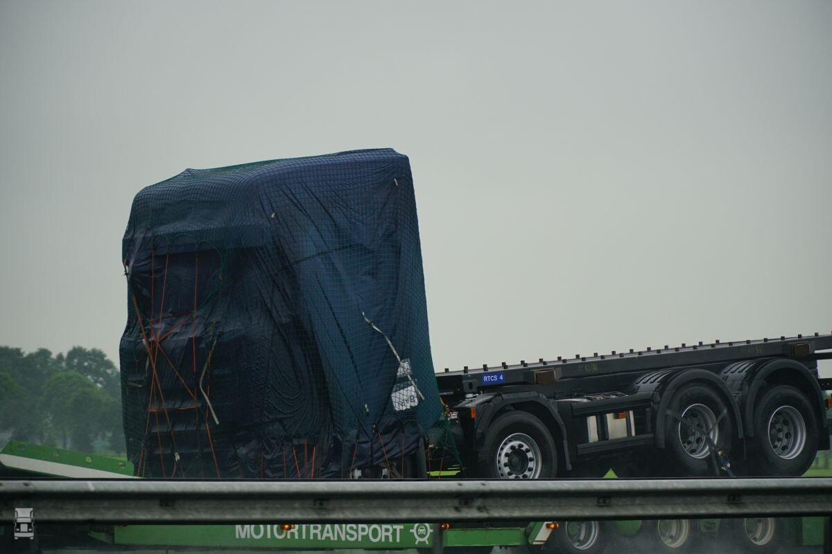 Een van onze oplettende lezers spotte deze afgedekte Scania onderweg op de A28, gewoon in Nederland. Let op de naar vorens staande, grof gelijnde grille, die duidelijk verder voor de voorruit staat. Zou dat camouflage plaatwerk zijn, of is dit wat we wellicht later dit jaar kunnen verwachten?