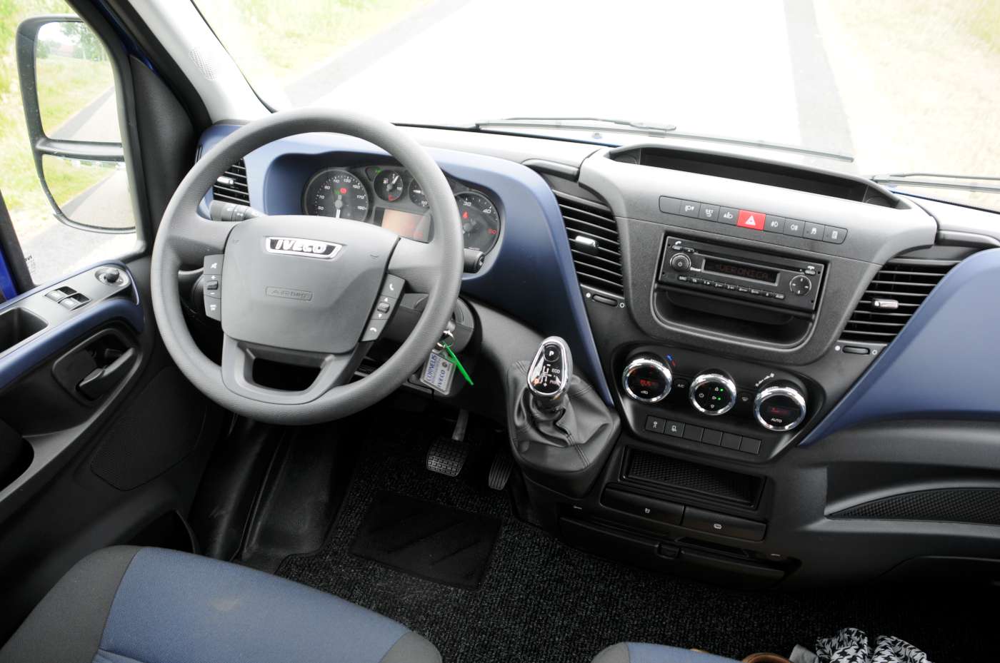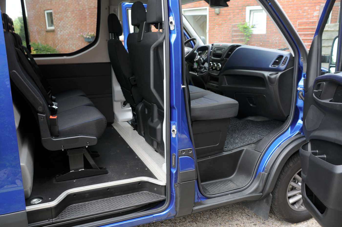 Het interieur is voorzien van blauwe details en dat geeft het dashboard zowaar een sjieke uitstraling. Het zal een optie zijn, maar het blauwe accent haalt net het saaie er vanaf. Zeker in combinatie met de fraaie verchroomde ringen van de verwarming oogt het hele interieur erg fraai. Zo’n Daily vormt ook een bijzonder fraai uitgangspunt voor een camper opbouw. Met dit interieur zou dat uitstekend passen. De chauffeursstoel is geveerd en optimaal verstelbaar. Er zijn keurige armleuningen en de positie achter het stuur is riant, ook als je wat groter bent. De zit op het bijrijdersbankje is wat minder. Zoals meestal het geval is blijkt ook deze tweepersoons bank geen verstelbare rugleuning te hebben. Daarmee is meerijden op die bank geen groot genoegen. Op de drie losse stoelen met armsteuntjes in de dubbele cabine zit het echter wel bijzonder aangenaam.