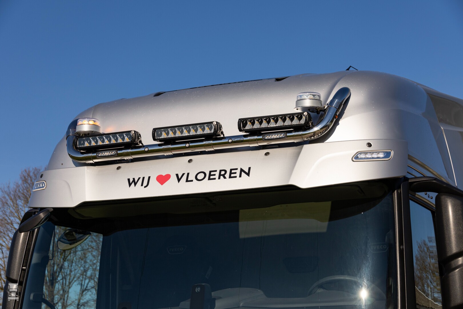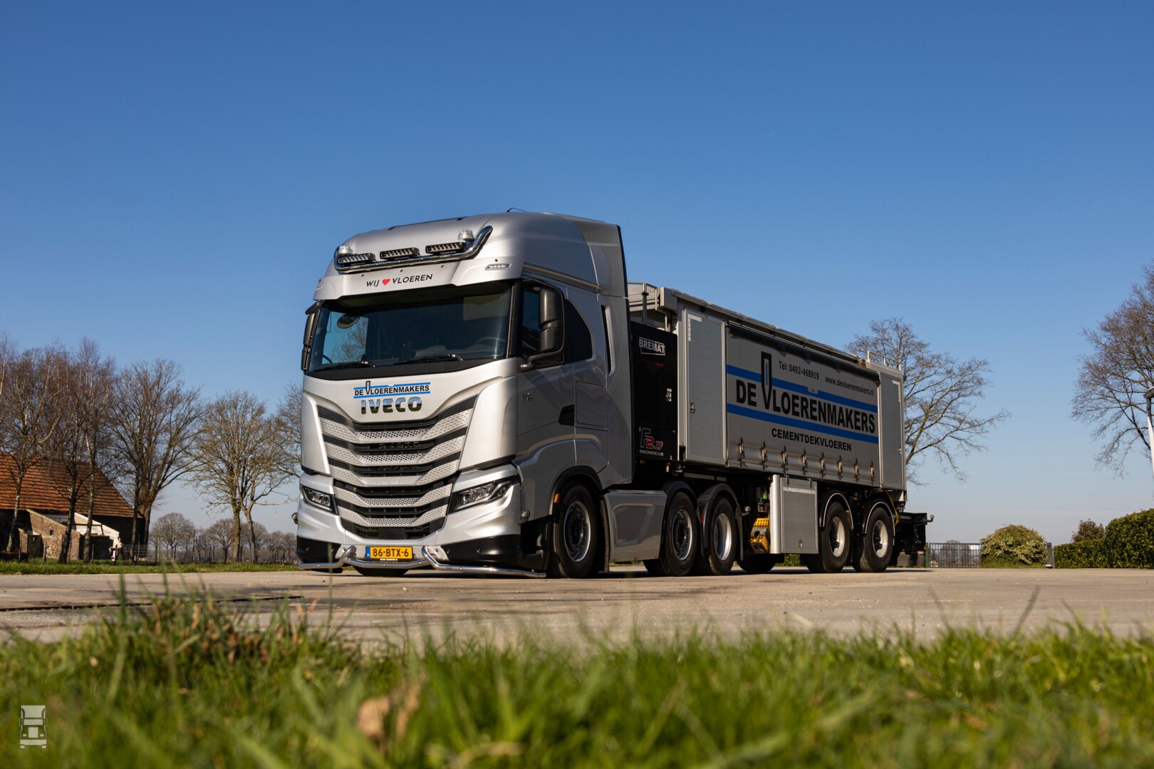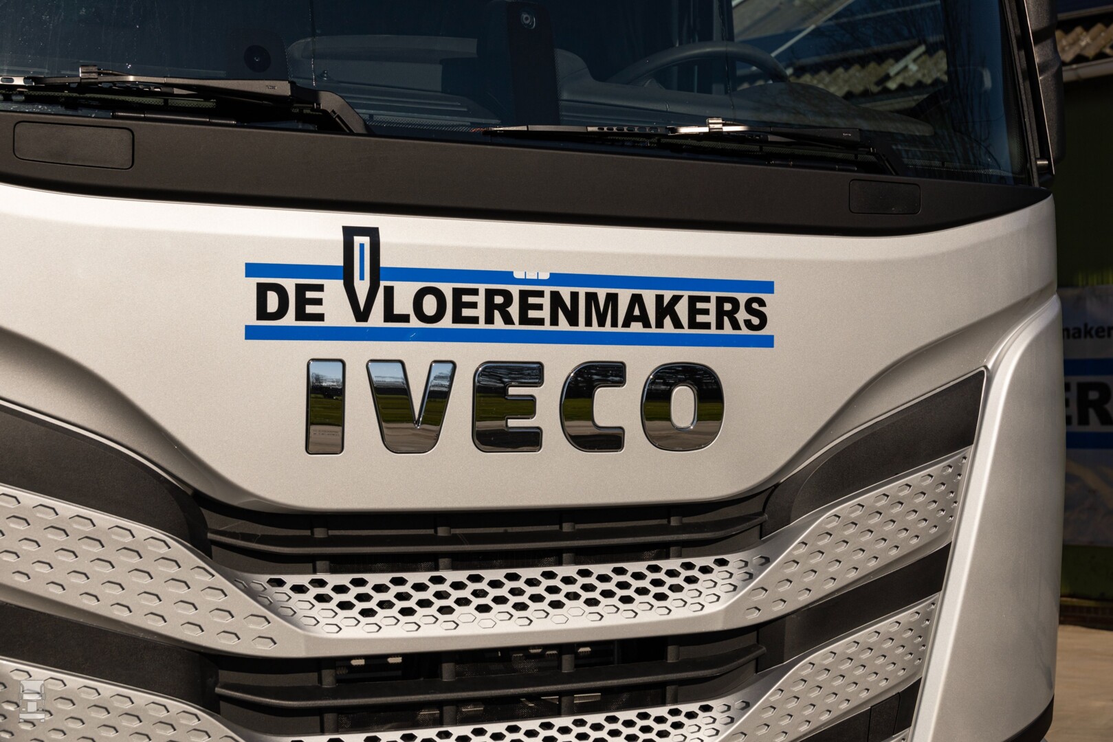 Maar ook aan de buitenkant is de trekker voor De Vloerenmakers een indrukwekkende verschijning. De kunststof side skirts in de cabinekleur gespoten en het gehele chassis voorzien van traanplaat met een opklapframe maken het geheel af en geven de vrachtwagen een stoere uitstraling.