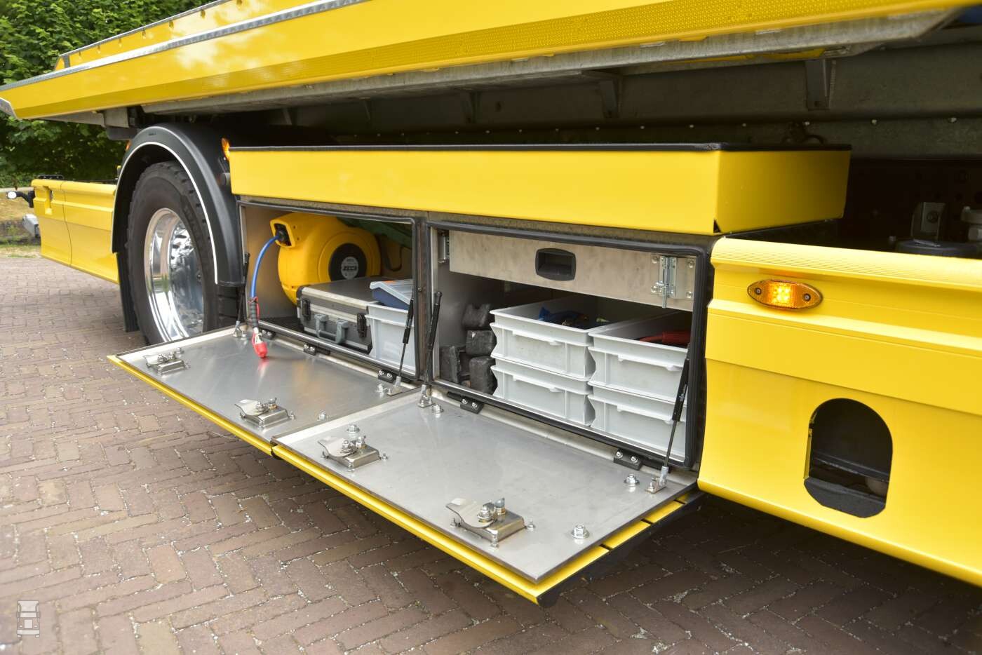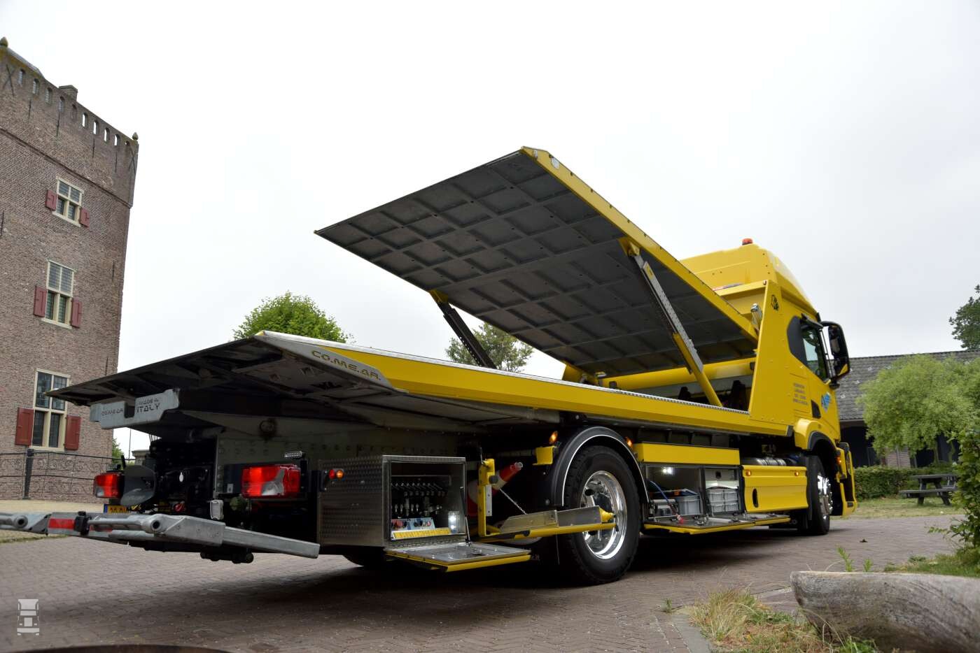 De opbouw van de Iveco is een Italiaanse Co.me.ar. De laadbak kan eenvoudig afgezet worden tot op straatniveau waarna eventueel met de lier schadeauto’s kunnen worden geladen. Doordat het bovendek hydraulisch omhoog kan, kunnen er twee auto’s geladen worden. "Deze opbouw munt uit in afwerking in alle details. Zo zijn de kisten keurig weggewerkt achter fraaie aluminium zijskirts en is de bak volledig gegalvaniseerd. Ook aan de montage van de bak op het chassis is veel zorg besteed" aldus Jeroen. De truck werd rechtstreeks vanuit de fabriek in Spanje afgeleverd bij Co.me.ar. voor de opbouw. Jeroen: "Ik heb de truck hoogstpersoonlijk opgehaald in Italië. Tijdens die rit was ik echt aangenaam verrast door het comfort aan boord".