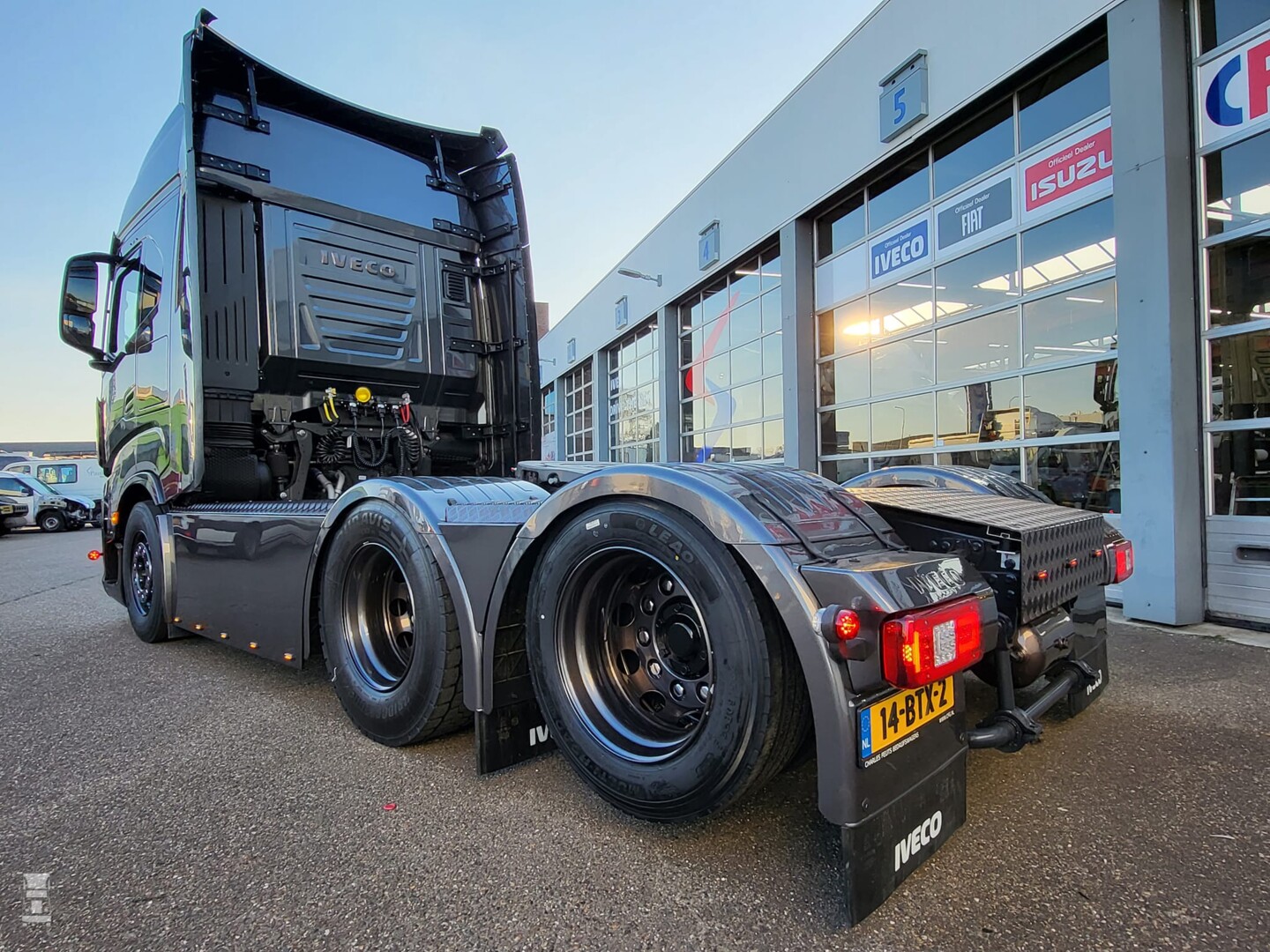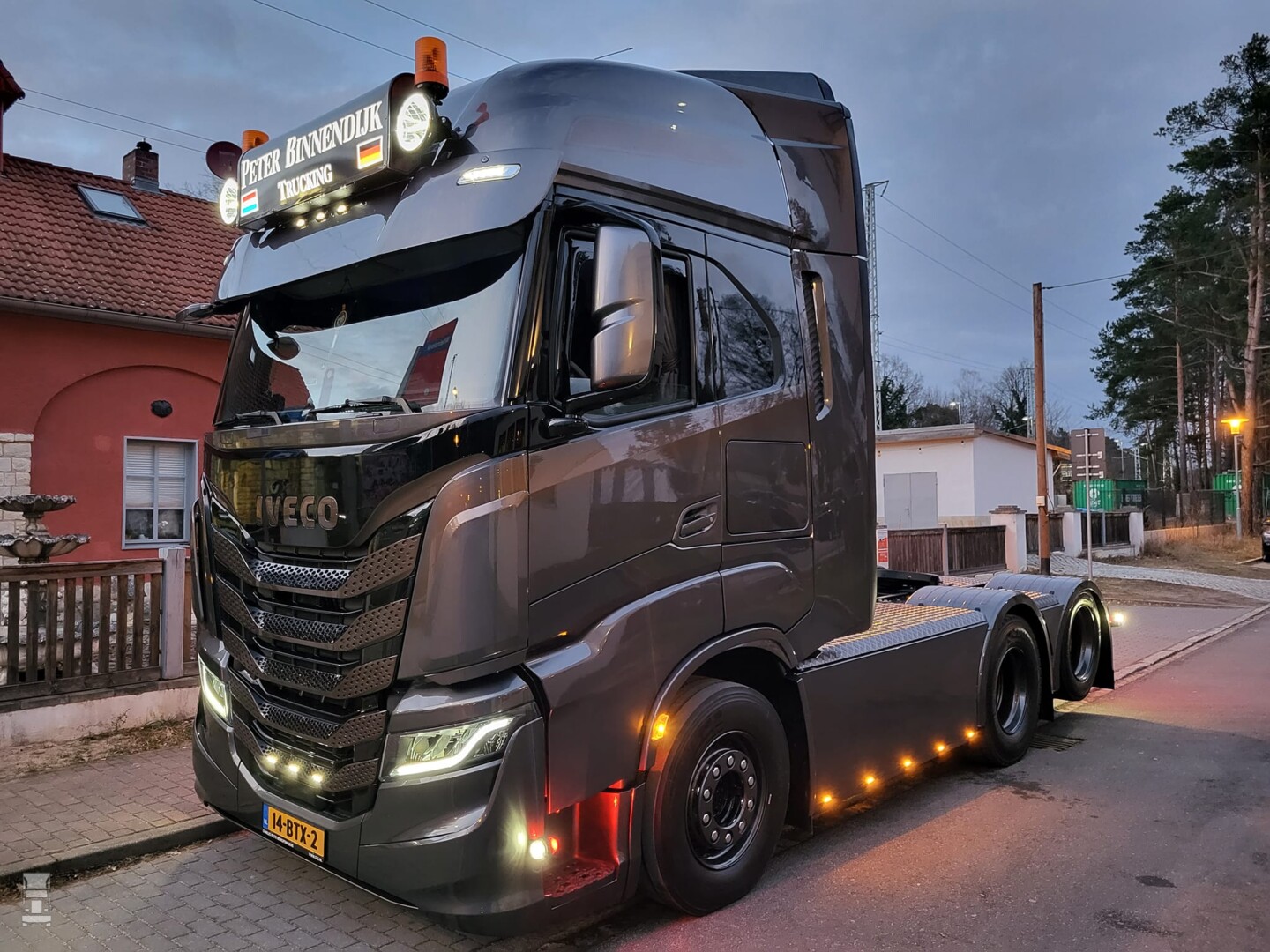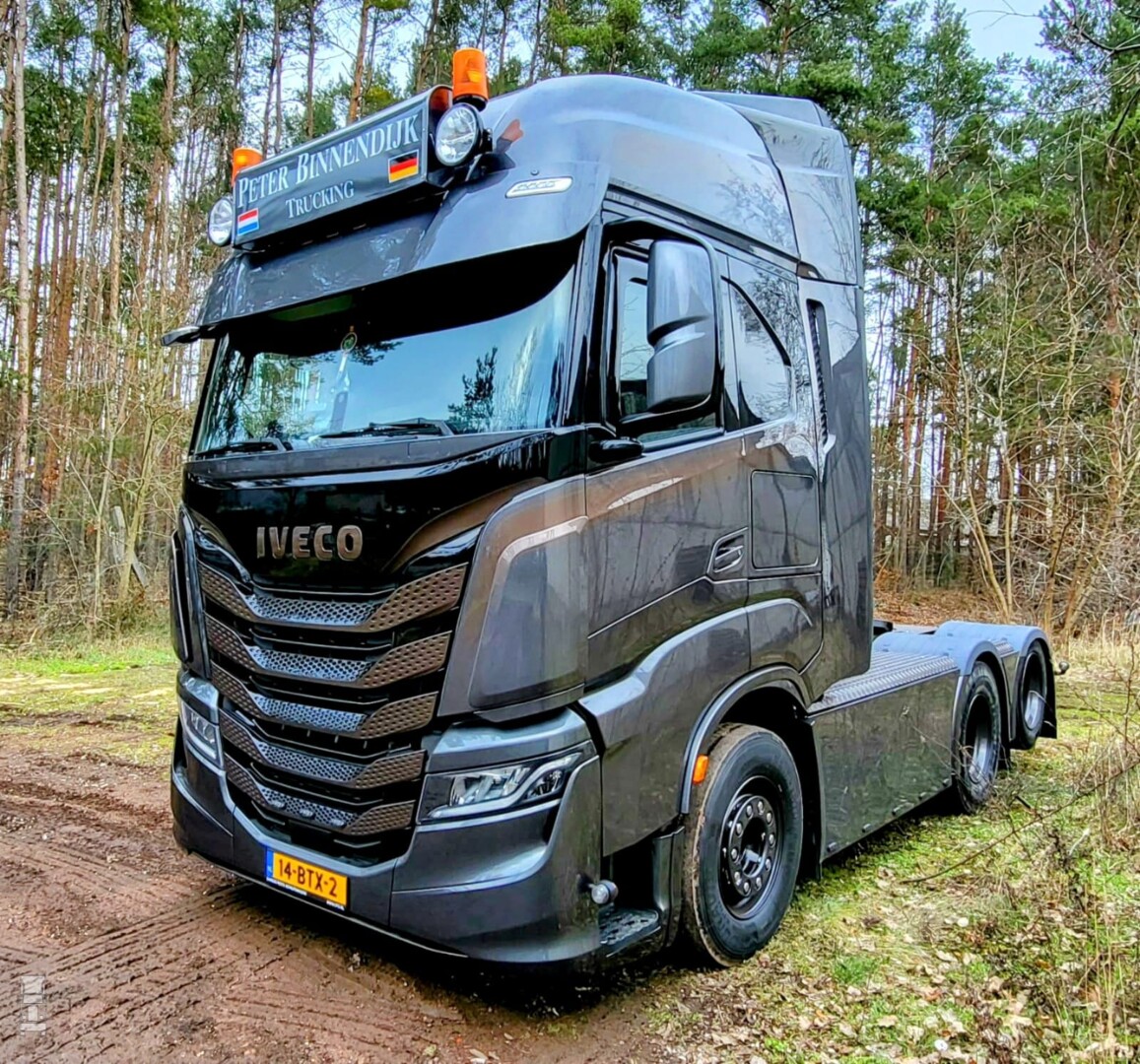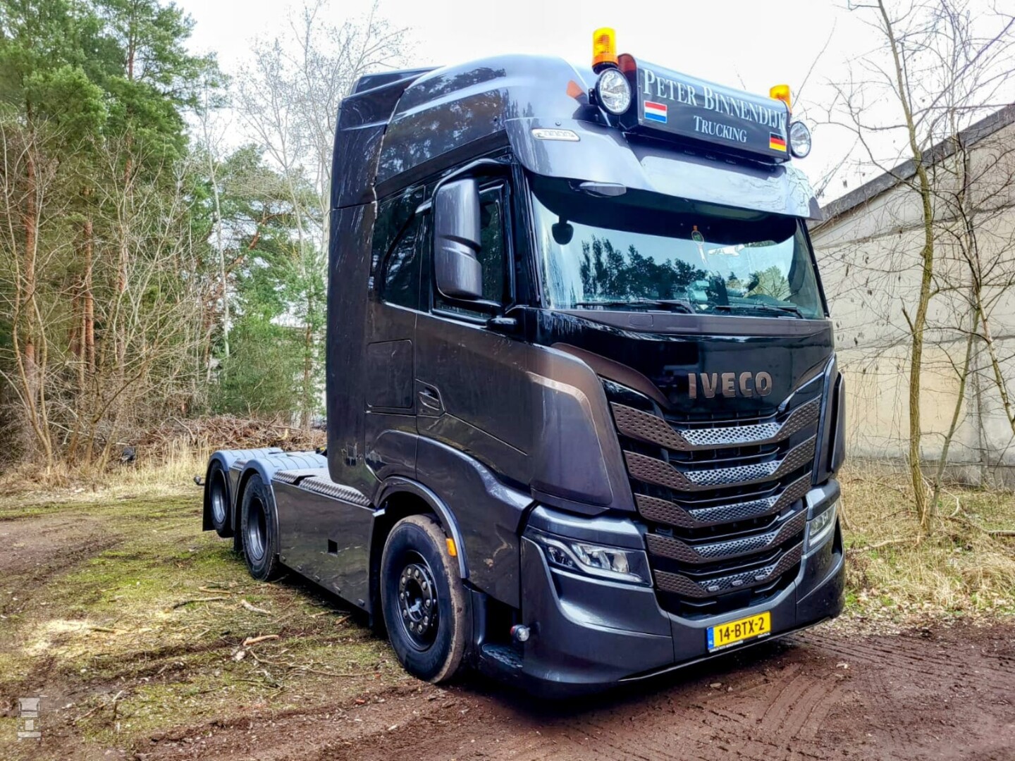 In de donkergrijze kleur met zwarte wielen en de stoere lichtbak met extra lampen is het een bijzonder indrukwekkend apparaat geworden. Verder is er een extra lange zonneklep gemonteerd, en is het chassis volledig afgedicht. Alles bij elkaar een geslaagde Iveco S-Way! De trekker werd afgeleverd door Charles Feijts Bedrijfswagens.