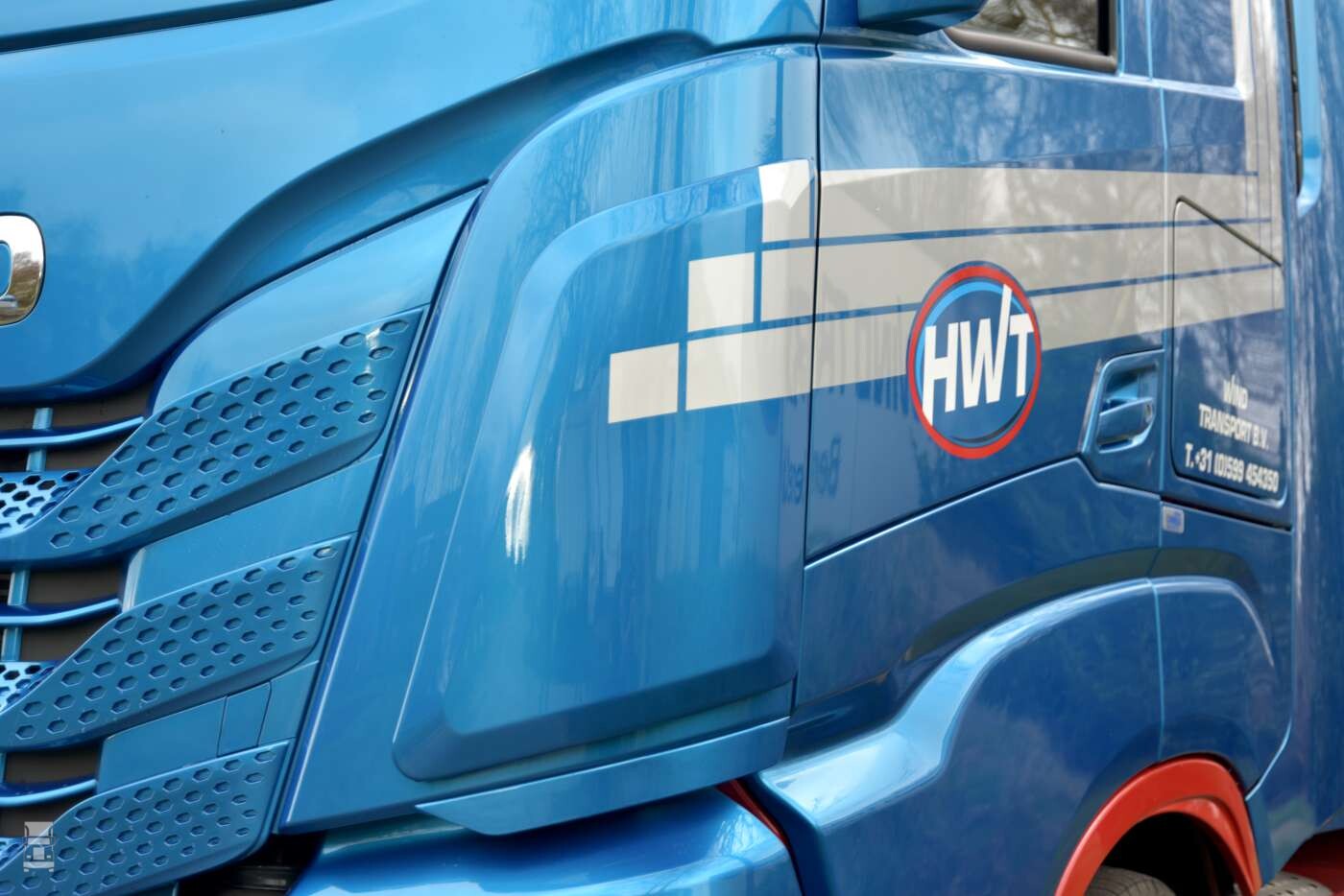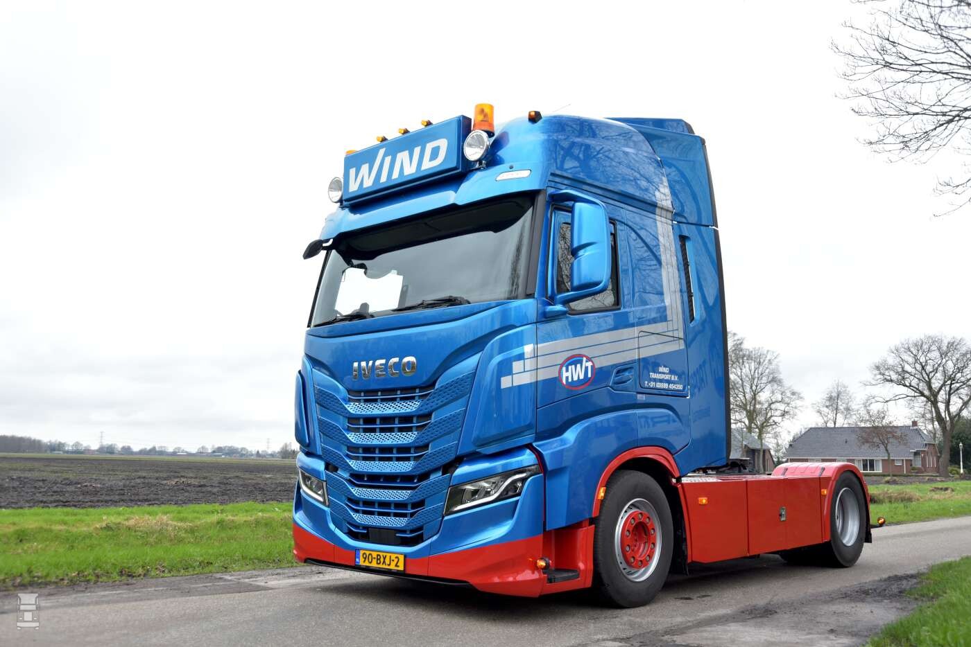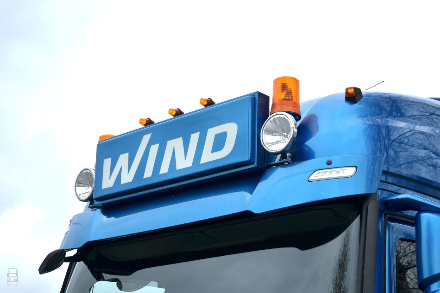 In de blauw- metallic Wind kleuren ziet de trekker er bijzonder goed uit. De, in kleur meegespoten zonneklep met daar boven de stoere lichtbak met extra verlichting en de in twee kleuren gespoten voorbumper staat er een bijzonder fraaie trekker. Op de hoeken van de cabine werden windkappen geplaatst die fraai met de vorm van de cabine mee lopen. Alles bij elkaar staat er een strakke truck voor de deur in Mussel.