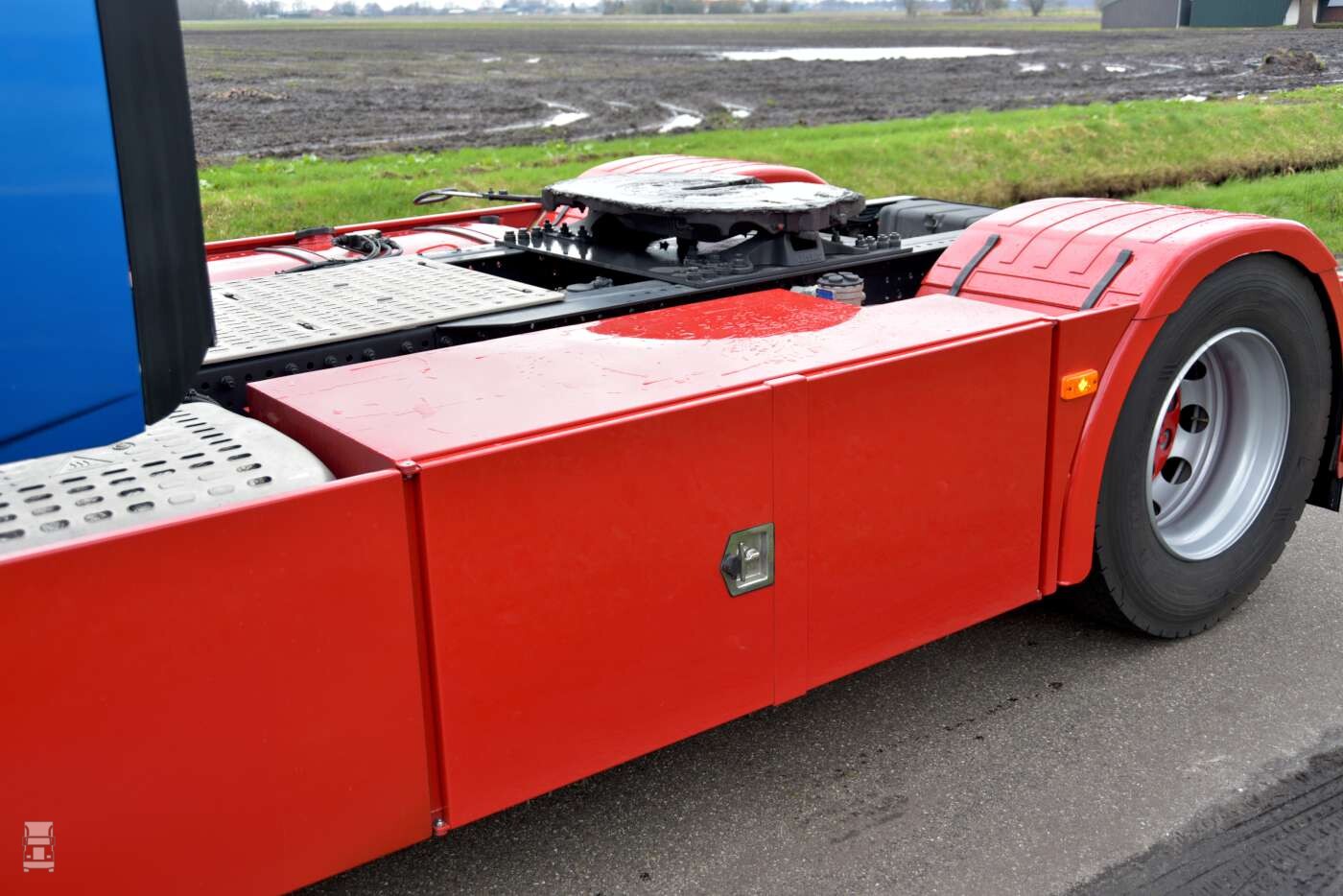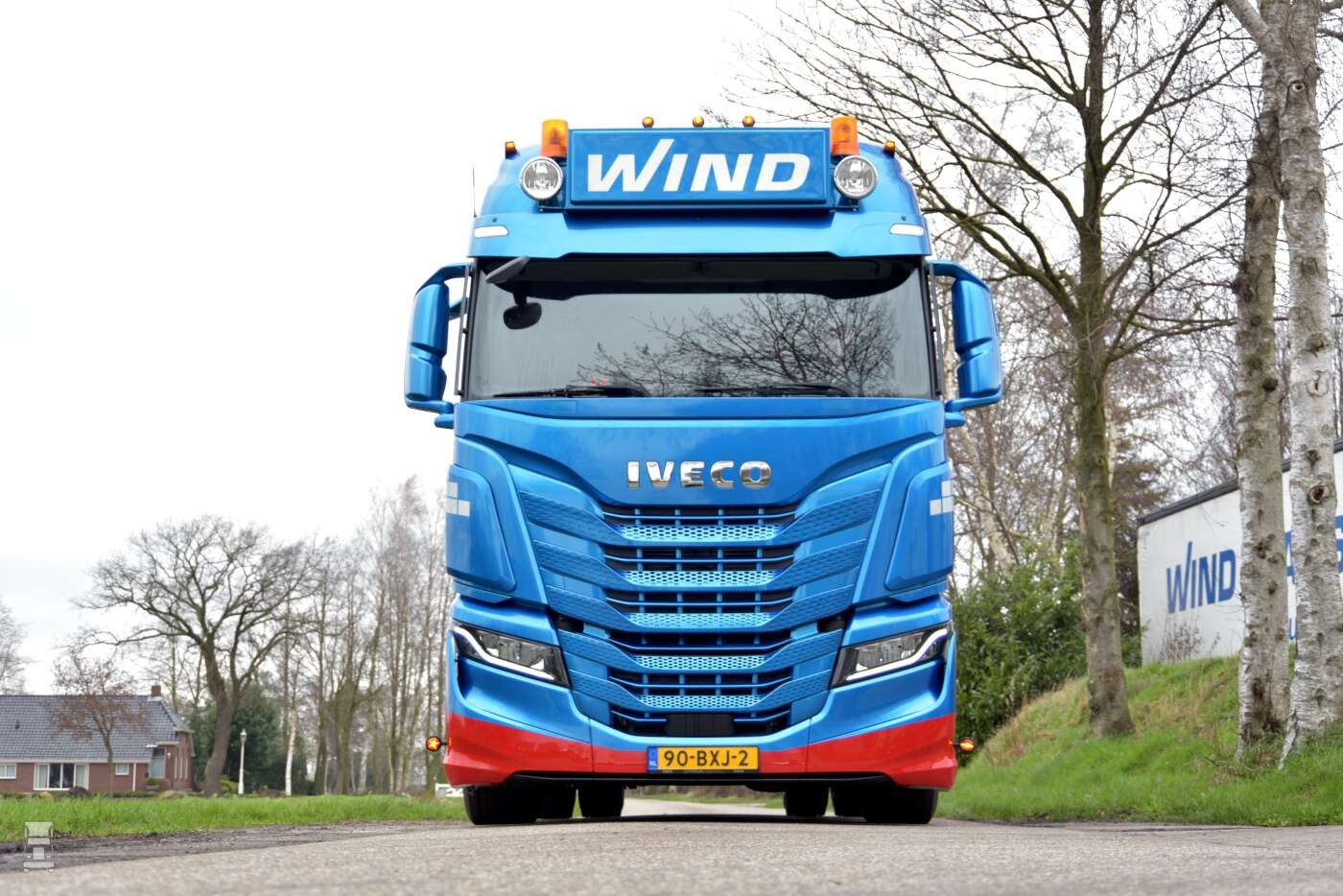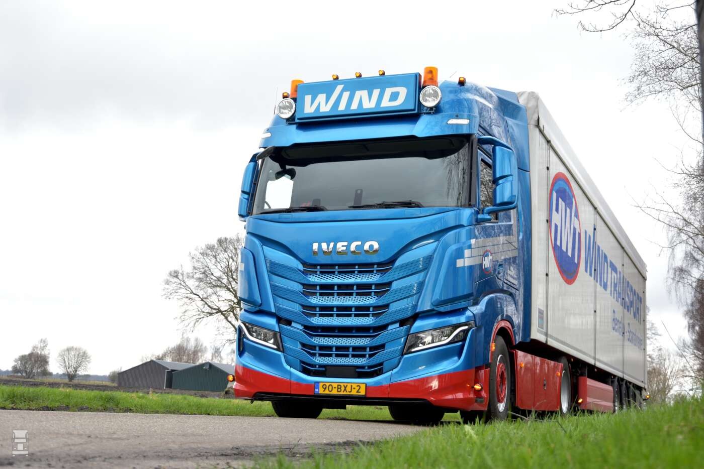 In de blauw- metallic Wind kleuren ziet de trekker er bijzonder goed uit. De, in kleur meegespoten zonneklep met daar boven de stoere lichtbak met extra verlichting en de in twee kleuren gespoten voorbumper staat er een bijzonder fraaie trekker. Op de hoeken van de cabine werden windkappen geplaatst die fraai met de vorm van de cabine mee lopen. Alles bij elkaar staat er een strakke truck voor de deur in Mussel.