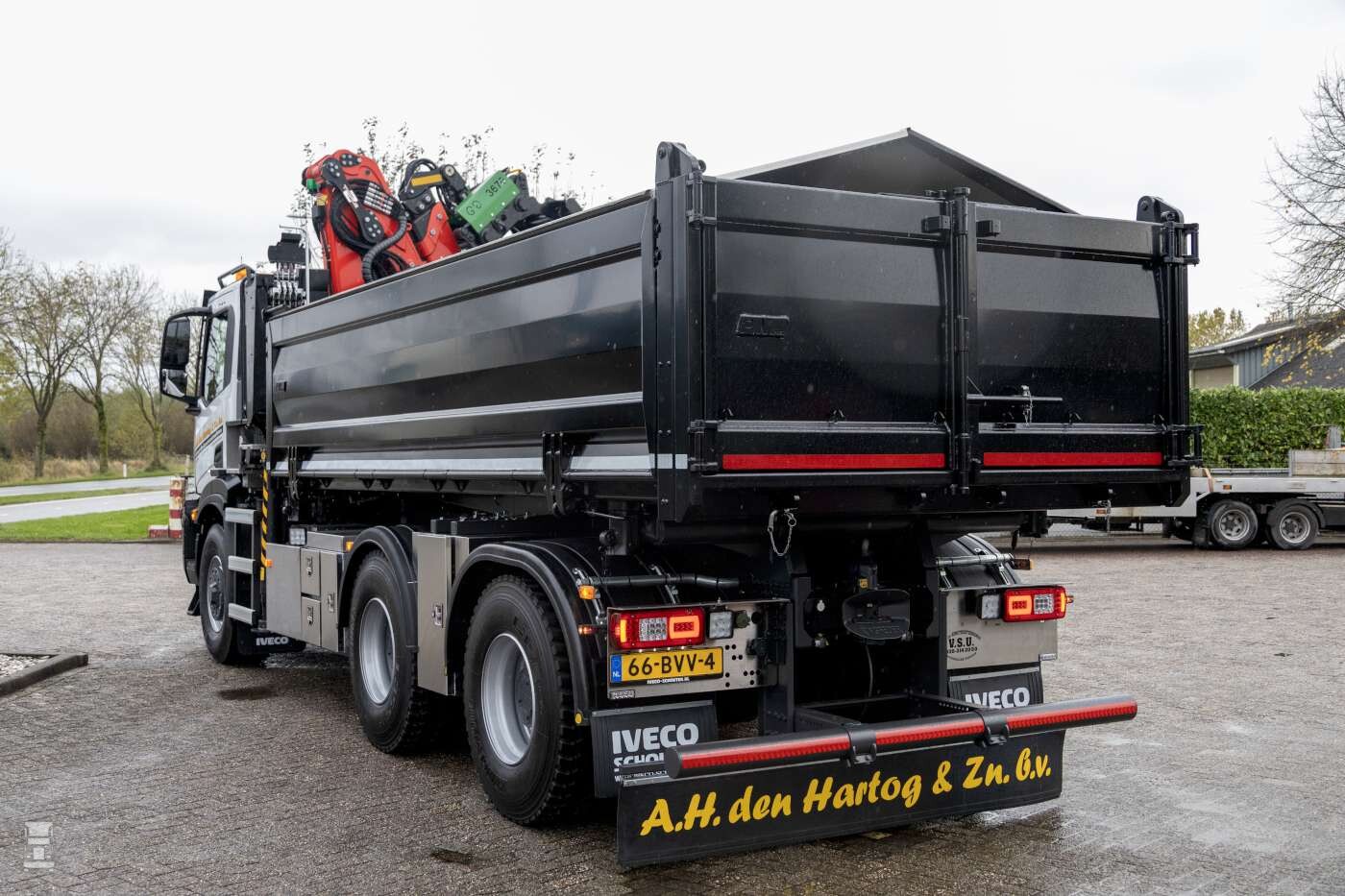 Flexibel is ook de nieuwe Iveco T-Way. Het voertuig is uitgerust met Hi-Traction. Dit is een hydraulisch aangedreven vooras, die – op verzoek – kan worden bijgeschakeld. Dit biedt aanzienlijke voordelen ten opzichte van een conventioneel 6x6 ontwerp, met minder slijtage tot gevolg. De Iveco is verder als eerste in Nederland voorzien van het Veldhuizen Hydro WSG Widespread systeem. Het systeem zorgt voor een hoger laadvermogen en maakt de auto nog wendbaarder. De achterste as van de T-Way stuurt tot 40km/h mee en het voertuig heeft een GVW van 33 ton. De opbouw van de kraan en kipper is verzorgd door Velis Scholten Utrecht.