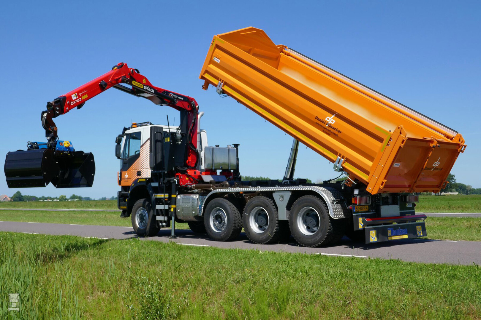 De vier-assige Iveco is voorzien van een kraan met een grote grijper en een driezijdenkipper opbouw met hydraulische milieukleppen. Desondanks resteert er met 17,5 ton een keurig laadvermogen waarmee Daniel Pijnacker BV uitstekend uit de voeten kan.