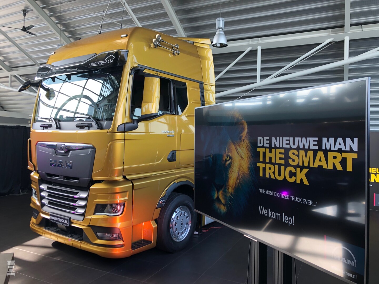 Vandaag mocht ik in Leusden even kijken naar de eerste nieuwe TGX in Nederland en ik moet zeggen dat de nieuwe MAN in het echt heel anders overkomt dan op een plaatje. Alle plaatwerk aan de cabine is vernieuwd, de voorbumper is indrukwekkend en ook het dak is helemaal nieuw. Ik moet eerlijk zeggen dat ik onder de indruk was van de verschijning van de goudkleurige nieuwe MAN. Ook het interieur is drastisch veranderd. Het dashboard is mooi om de chauffeur heen gevormd, zo'n beetje als in een Scania. Ook de stuurverstelling komt een heel eind in die richting. Het digitale dashboard zelf is gewoon mooi, en dat geldt ook voor de handige bediening van allerlei geavanceerde functies aan boord. Zo is de bediening van de versnellingsbak nu net als bij de meeste merken aangebracht in een handle aan de stuurkolom. Dat is wel zo praktisch en het scheelt ruimte, want daardoor kon die console op de vloer weg.