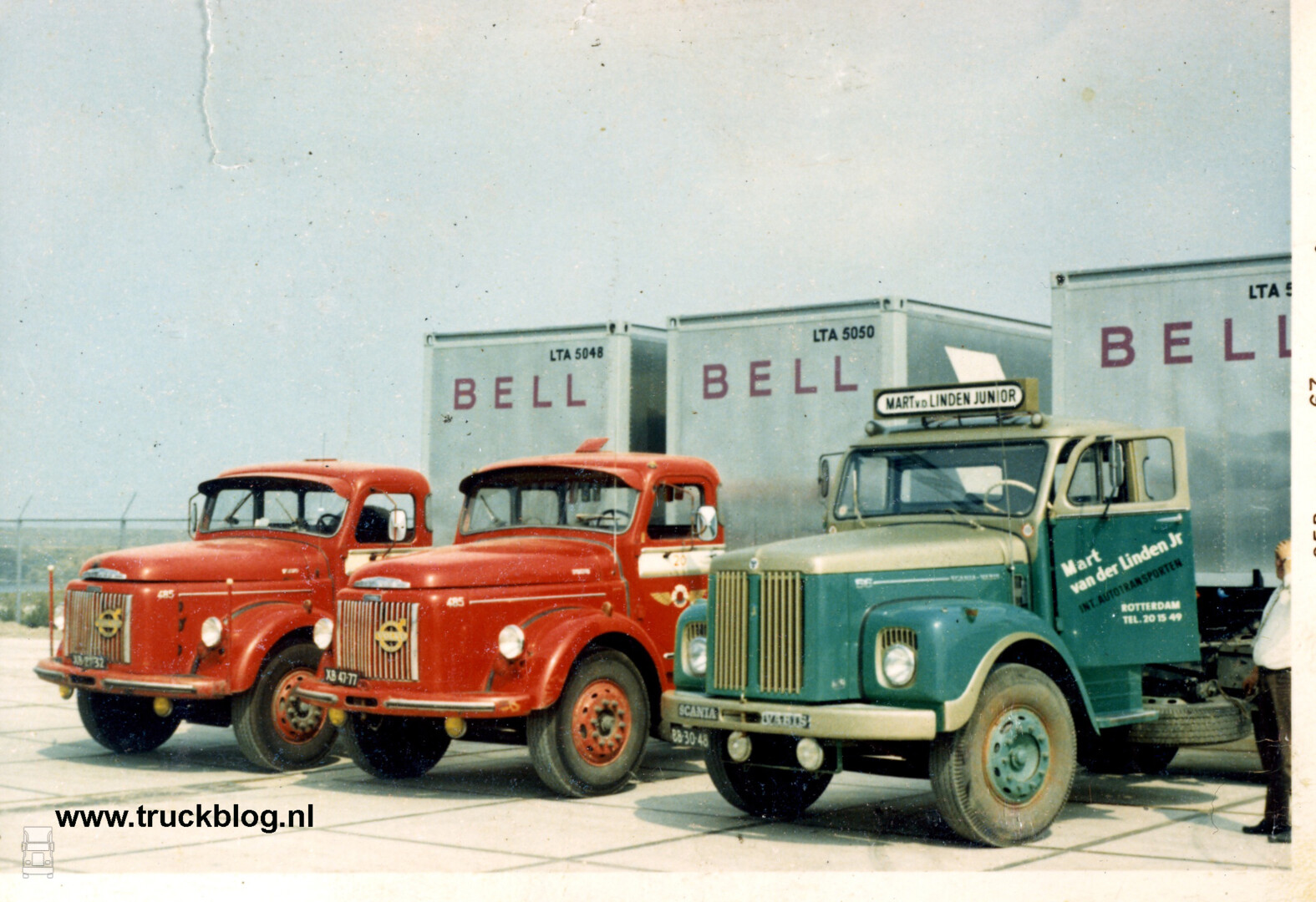 Opvallend is dat de Scania een maatje groter leek dan de Volvo trucks. Leuk is dat Van der Linden toen al een lichtbak op het dak had! De mannen reden zoals je ziet voor Bell containers, een bedrijf wat inmiddels al jaren niet meer bestaat. De Bell containers werden later vooral bekend door hun opvallende paarse kleuren. Deze foto vond ik in mijn eigen archief, maar waar hij ooit vandaan is gekomen en wie hem gemaakt heeft is mij niet duidelijk. Van belang is dat we dit prachtige tijdbeeld bewaren!