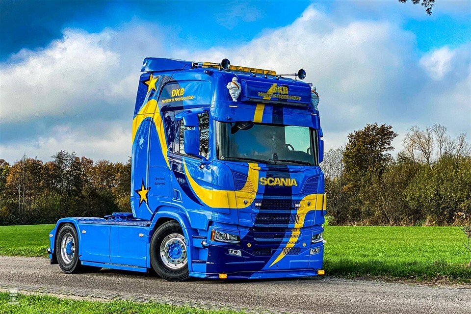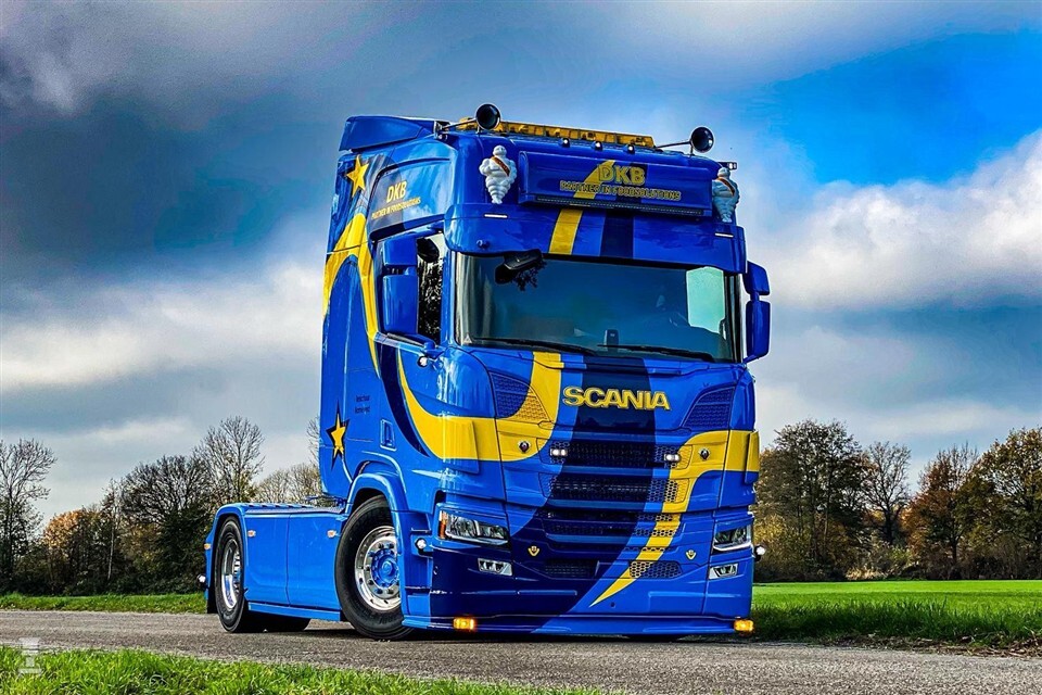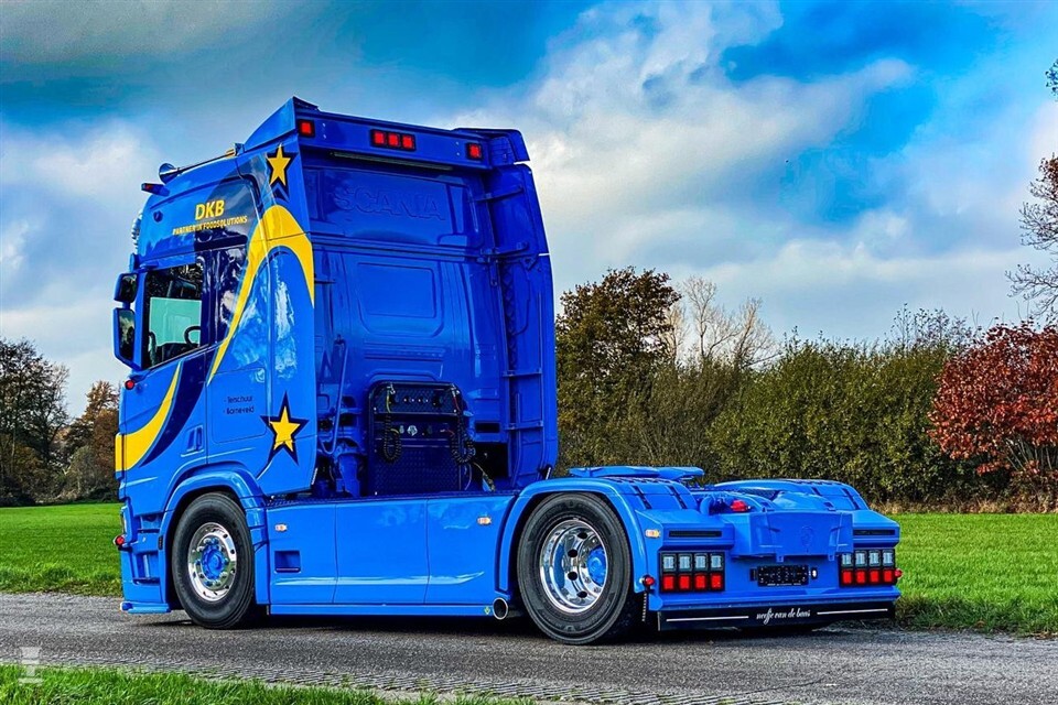 Opvallen doet deze Scania R530 zeker. Spuiterij Van Winkoop spoot hem in een opvallende kleur blauw. Wilde strepen in donkerblauw en felgeel over de hele cabine laten de Scania knallen. DKB Foodsolutions voorziet zijn vrachtwagens al jaar en dag van deze kleurstelling. Bij Vlastuin werd de nieuwe Scania opgebouwd als een echte showtruck.