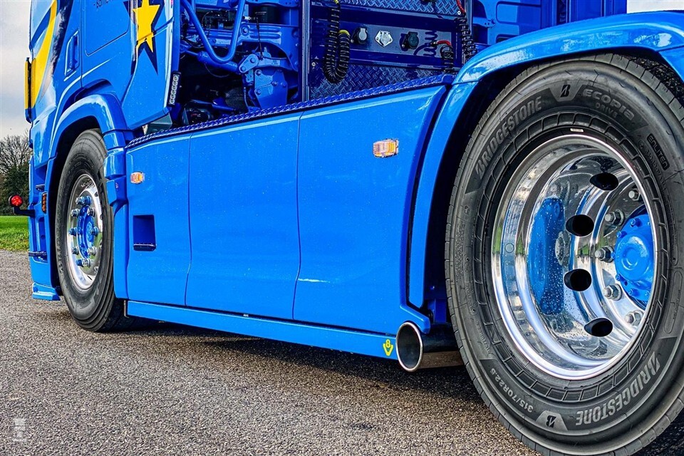 Aan de voorkant kreeg de Scania een nieuwe zonneklep en een imposante onderbumper met verlichting. Een lichtbak en Michelin-poppen mochten eveneens niet ontbreken. Opvallend genoeg zijn de toplampjes op het dak afkomstig van Volvo. Op het dak is een flinke zwaailamp-balk gemonteerd, voor als de Scania nog iets meer moet opvallen.