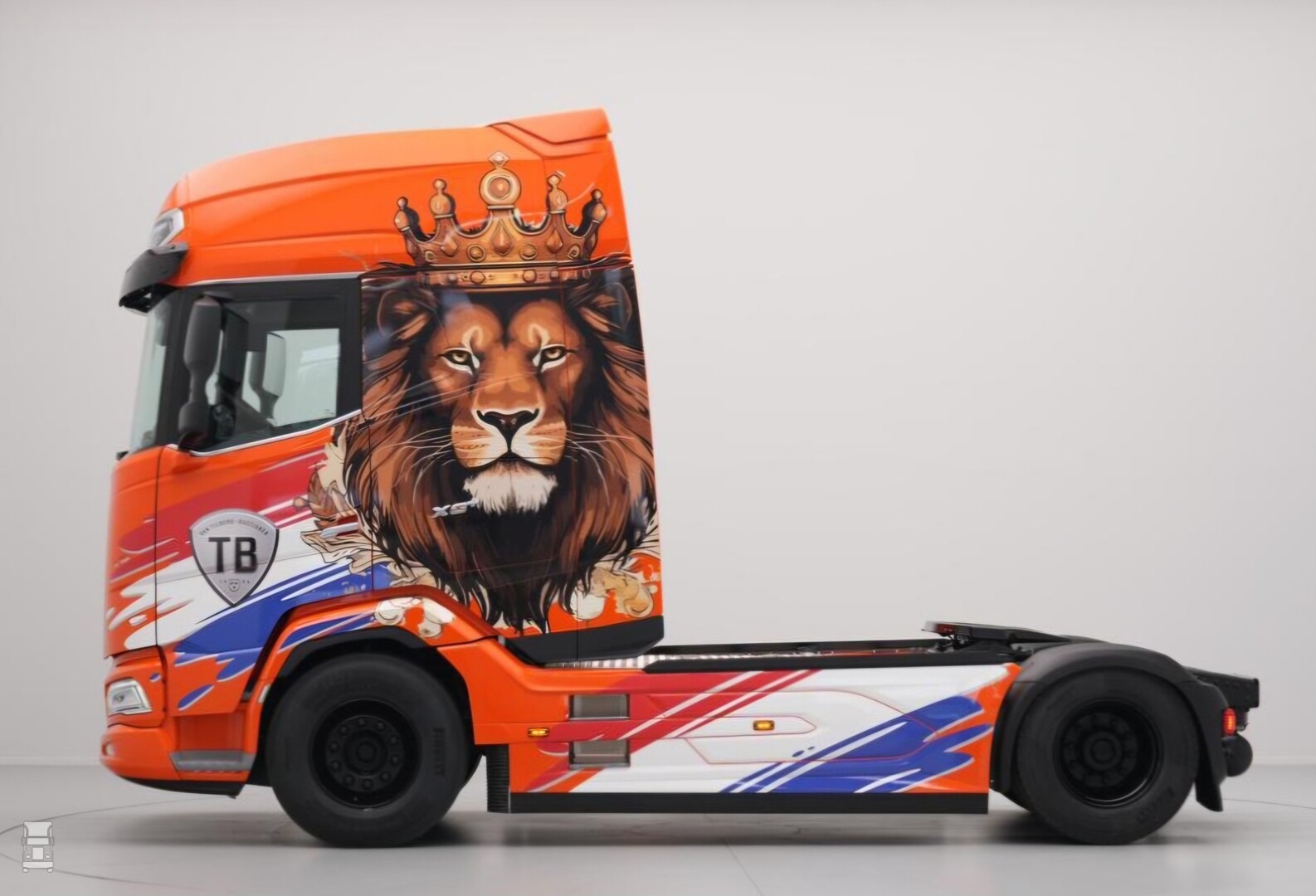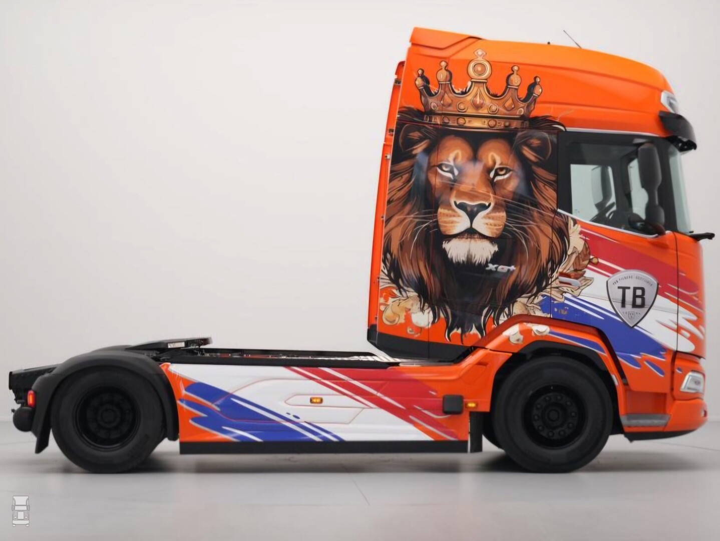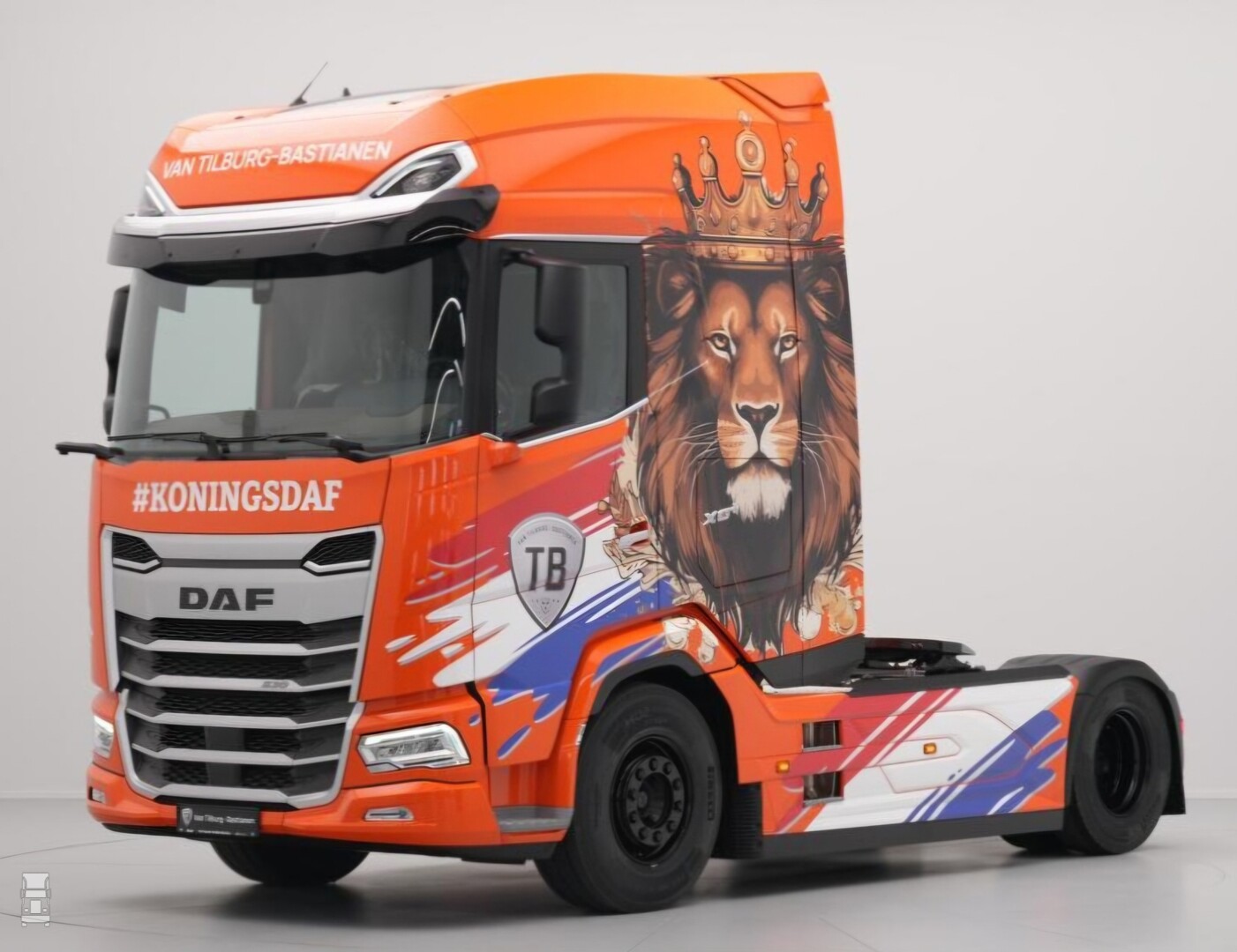 De KoningsDAF is voorzien van rood- wit- blauwe striping en een gekroonde leeuw op de zijkanten. Zo'n XG+ cabine leent zich door zijn omvang uitstekend voor zo'n reclame uiting. Of Willem zelf met de truck gaat rijden is niet waarschijnlijk, maar het is een leuke marketing stunt van TB.