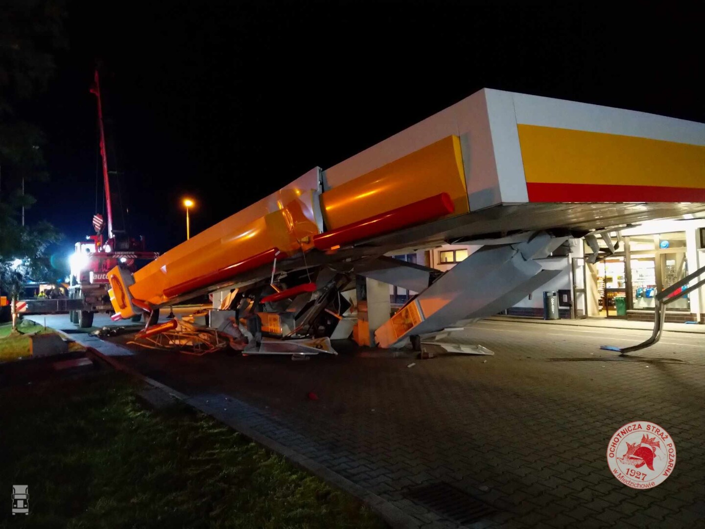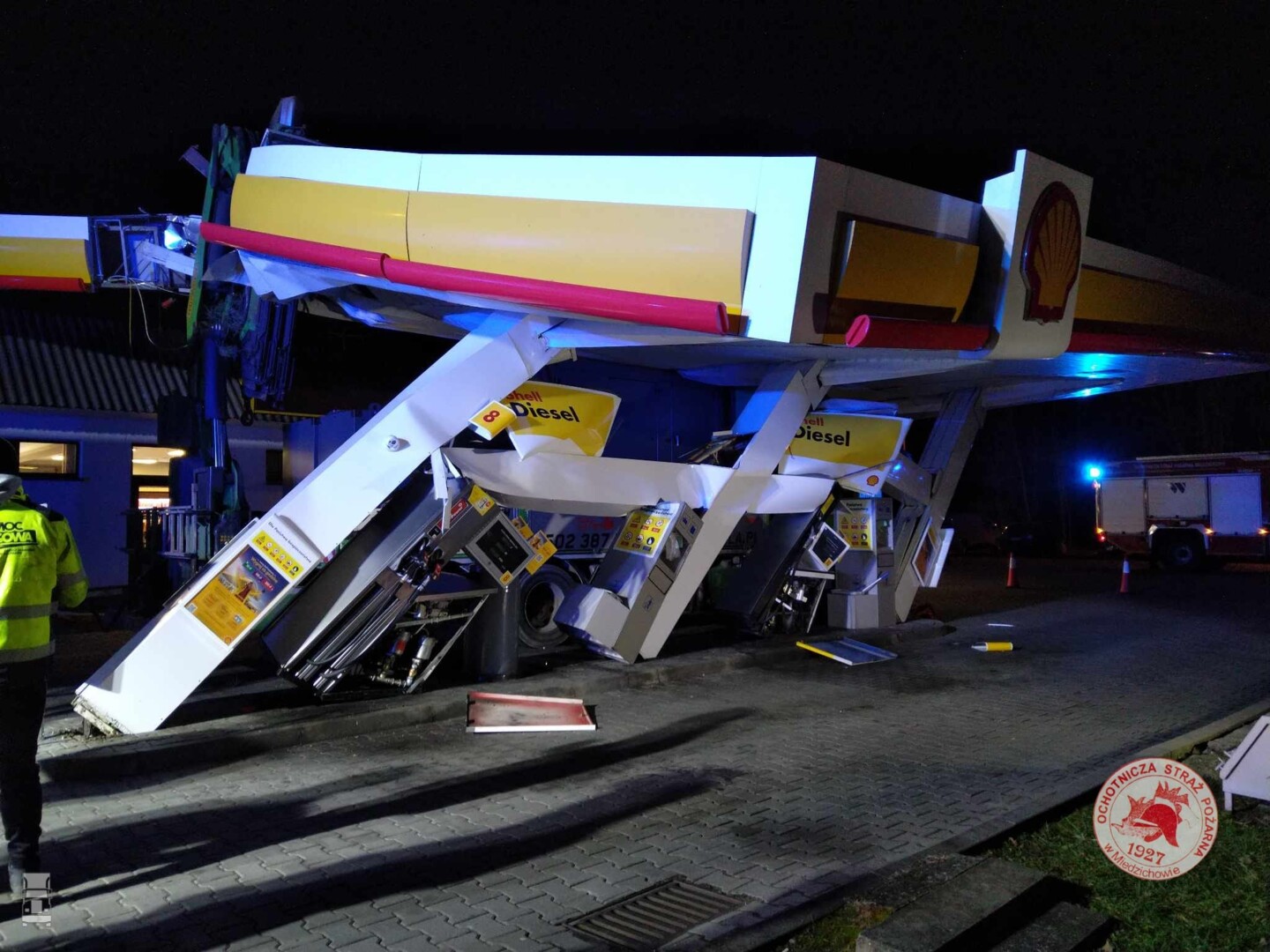 De Iveco met de omhoog staande Palfinger autolaadkraan richtte behoorlijk wat schade aan bij het tankstation. De schade bedraagt naar schatting rond een miljoen Zloty, omgerekend zo'n kwart miljoen Euro. Een geluk bij een ongeluk was dat er geen brandstof lekte uit de pompen, waardoor brand uitbleef. Bron: 40ton.net