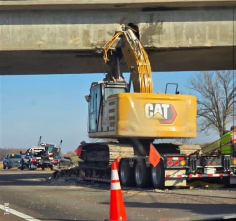 Het ongeluk gebeurde vorige week op U.S. Highway 75 bij Melvern. Een vrachtwagen met een graafmachine op een dieplader kwam in aanraking met een betonnen viaduct. De arm van de Caterpillar 323 was niet naar beneden gedaan, dus de vrachtwagen was veel te hoog voor de brug. Dit viaduct is een van de weinige in de omgeving. Bij het ongeluk, waar verder geen andere voertuigen bij betrokken waren, raakte de 46-jarige chauffeur lichtgewond.
