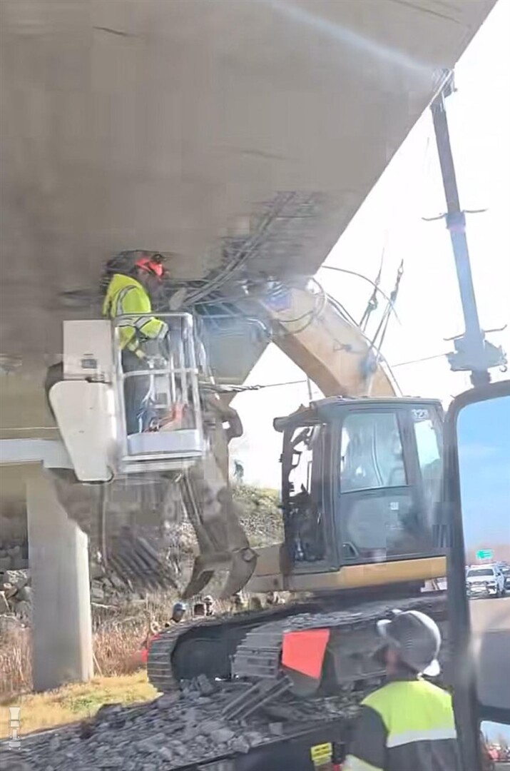 Wat dit ongeval opzienbarend maakt, is het feit dat de arm van de graafmachine dwars door het viaduct ging. De punt van de arm steekt bovenuit het wegdek: het viaduct is volledig doorboord. Dat moet een flinke klap gegeven hebben. De graafmachine weegt bijna 30 ton, dus die geeft niet mee en waarschijnlijk reed de vrachtwagen op flinke snelheid. Dan nog vragen we ons af hoe sterk die brug is geweest, als de machine er een gat in slaat.