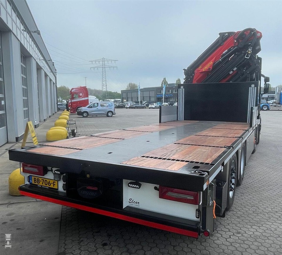 De Scania R460 8x2 is voorzien van een laag chassis en twee luchtgeveerde 10-tons voorassen. De bakwagen heeft bovendien een volledige innerliner in het chassis. Dit is nodig voor de frontstempel. Achter de cabine bouwde J.L Muns uit Hardinxveld-Giessendam een flinke Palfinger kraan. Elcar uit Meerkerk voorzag de Scania van een open laadbak.