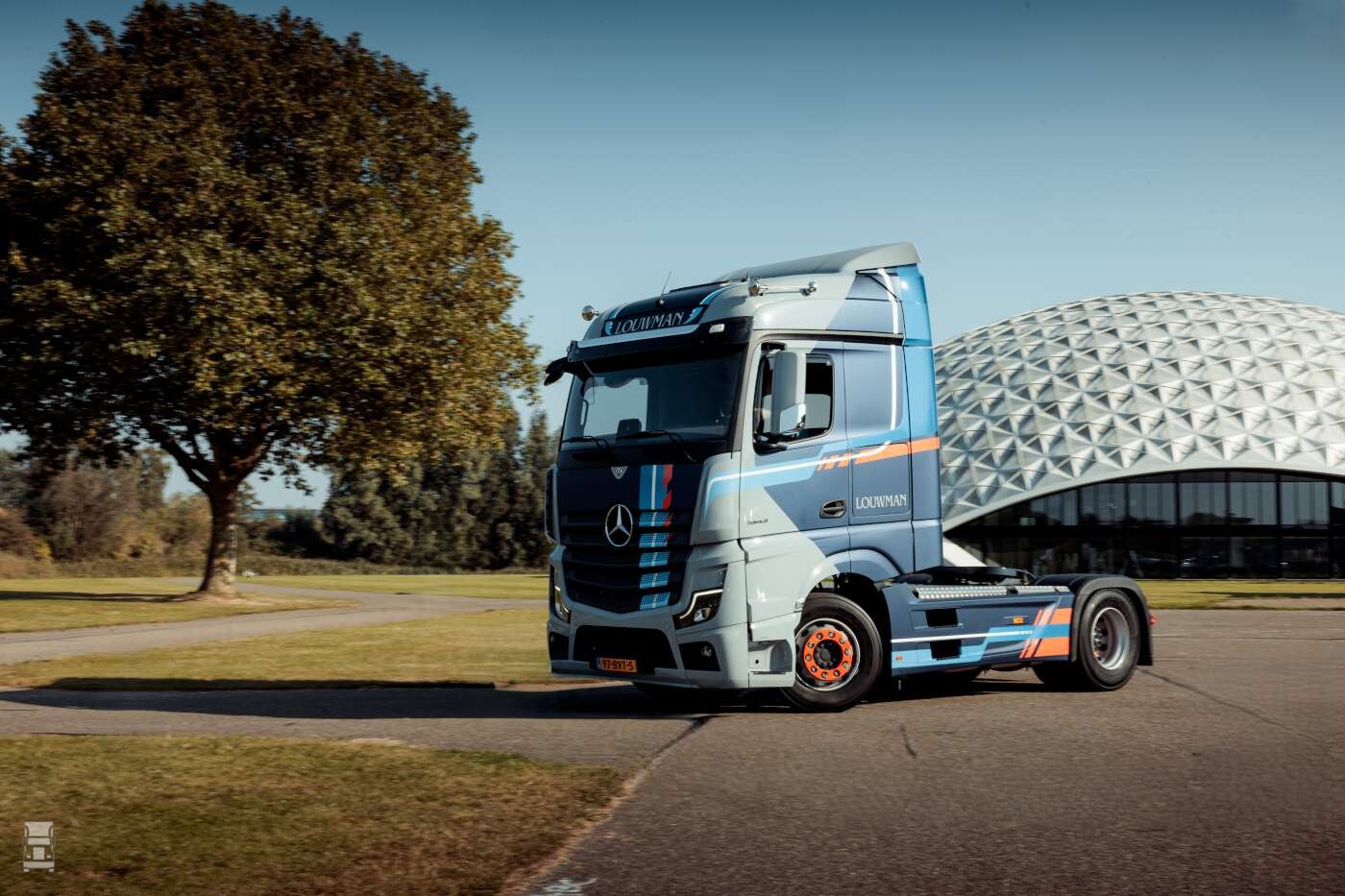 De Louwman bedrijfswagenorganisatie voor trucks en bestelwagens is het afgelopen jaar verder geprofessionaliseerd. Om dat extra kracht bij te zetten, liet Louwman Bedrijfswagens speciaal een Actros 1943 trekker ontwerpen met de naam Louwman Edition. De toch al indrukwekkende truck van Mercedes-Benz heeft een opvallend matgrijs en blauw design gekregen. Met luchthoorns, een chassis dat volledig met vlonderplaat is dichtgebouwd en stijlvolle oranje accenten op onder meer de velgen, is het een echte chauffeursauto geworden. De truck is tijdens het Mega Trucks Festival twee dagen te zien op de stand van Louwman Bedrijfswagens. Met de cabine naar voren, krijgen bezoekers ook letterlijk een kijkje onder de motorkap. Op de stand kan men bovendien kans maken op een van de 1:18 schaalmodellen van de Louwman Edition die in gelimiteerde oplage wordt uitgegeven.