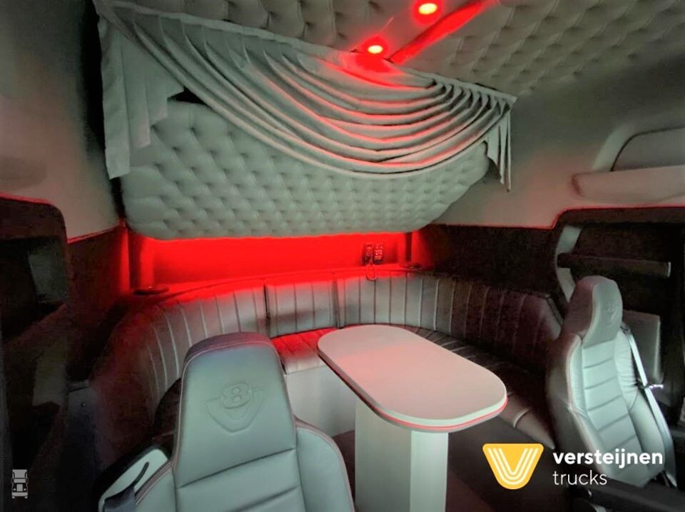 De cabine is maar liefst één meter verlengd. Door Truckstyling Lunteren is het interieur voorzien van een luxe zithoek met tafel en daarboven een flink bovenbed. Door Vlastuin Truckopbouw uit Renswoude is deze Scania voorzien van diverse accessoires, waaronder staande uitlaten, tranenplaatvlonders en een achterbumper. Op het dak heeft Vlastuin een door henzelf ontwikkelde lampenbeugel met bijbehorende verstralers gemonteerd. De complete opbouw is gedaan in overleg met hun vaste en gewaardeerde klant Versteijnen Truck uit Gilze Rijen, aan wie deze schitterende showtruck is verkocht.