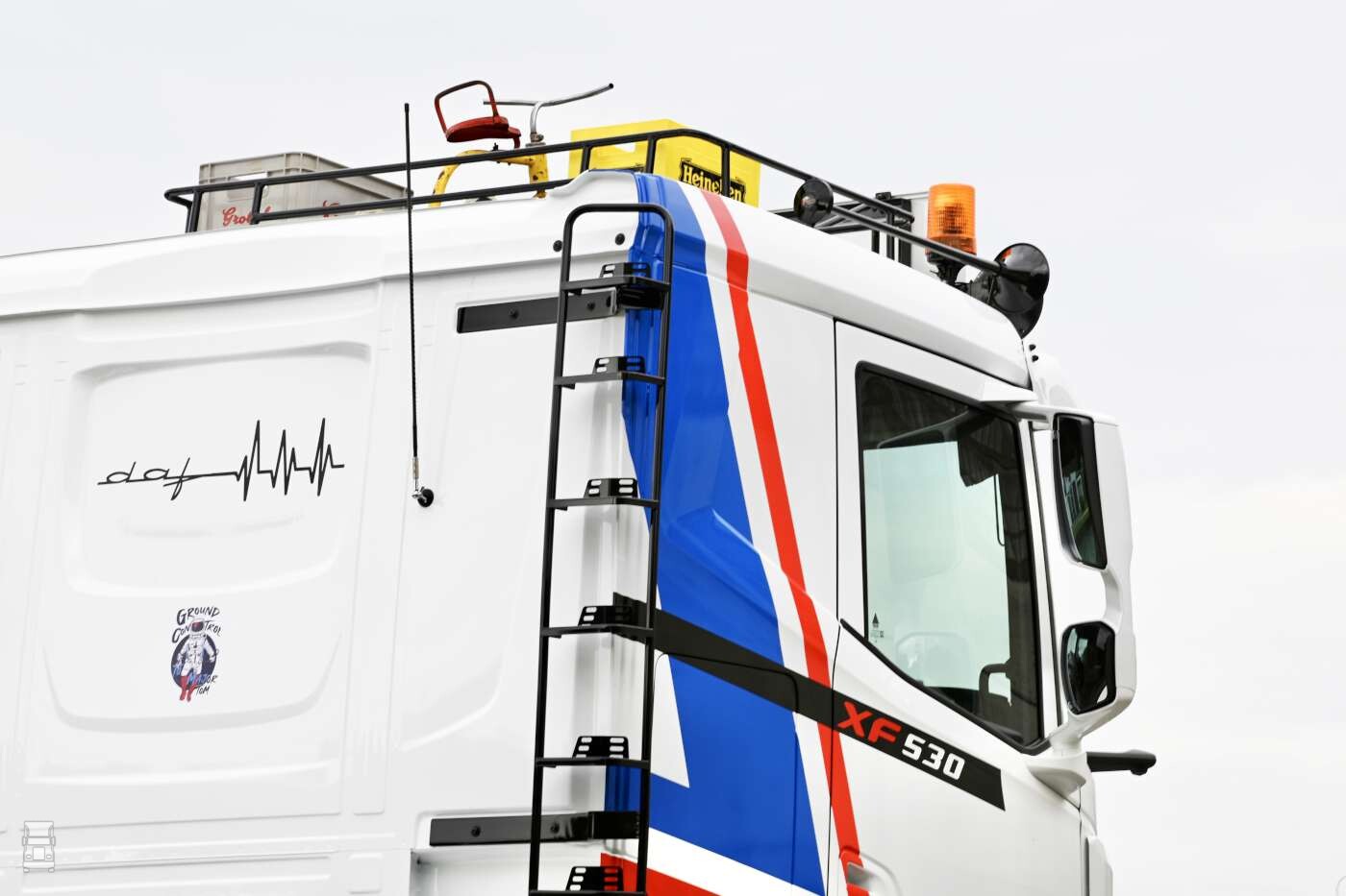 Bakker Bedrijfswagens wilde eigenlijk voor een spectaculaire kleur gaan, maar door de beoogde retro look konden zij natuurlijk niet voorbijgaan aan de ‘good old’ DAF ATI uit de eind jaren 80. Niet alleen de kleuren maar ook de tekst ’ground control’ past deze DAF als een op maat gemaakt pak. Luchtvering rondom en de lage slaap cabine geeft deze DAF een stoere lage ‘’stance’’.