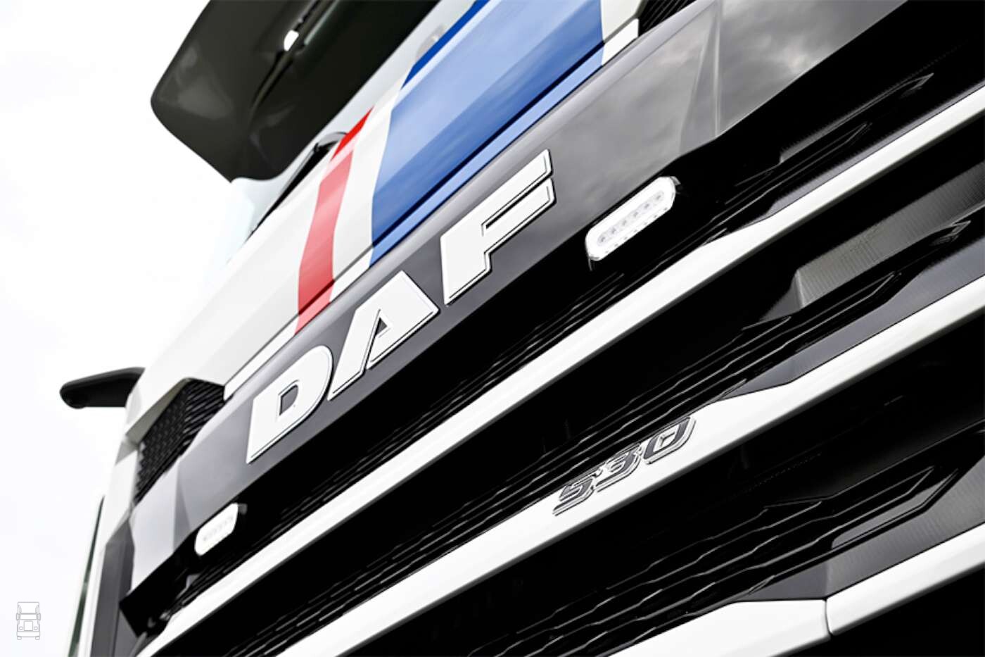 Dit keer is gekozen voor een cabine die nog niet veel zichtbaar is; een lage slaapcabine op de XF-variant. DAF heeft de geïntegreerde stand-airco inmiddels ook leverbaar gemaakt voor andere cabine-varianten dan de XG+. Dus het dak-rek zit het klimaatbeleid van de chauffeur in ieder geval niet in de weg. Uiteraard konden de trapjes, aan weerszijde van de achterkant van de cabine, niet ontbreken. En wat te denken van de Engelse zonneklep! Een op maat gemaakte variant voor een uniek project. Dit tezamen met de lichtbak incl. verstralers, zwaailampen en luchthoorns zetten het ’oldskool’ gevoel éxtra kracht bij. De bumperspoiler, hoekschilden, side-skirt verlengers (incl. opvulhoekje) en de spatscherm-verbreders geven de truck extra body.