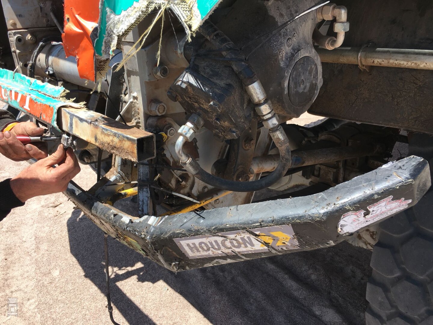 Ton van Genugten was weer mooi onderweg naar het podium, maar verspeelde in de koninginnerit twee uren waardoor dat nu wel erg moeilijk wordt. Hij staat nu zevende algemeen, op slechts drie minuten achter Ardavichus die vijfde staat. Ton: “Ergens tussen kilometer 40 en 50 reed ik van een duin af en direct daar achter lag weer een duin en een stukje piste met stenen. Ik kwam met de voorbumper hard in het zand en dat stukje stenen terecht. Daarbij brak de koppeling van de stuurpomp af. Waarschijnlijk hebben we iets te snel willen zijn, want na een half uur rijden liep weer de olie van de stuurbekrachtiging eruit en moesten we opnieuw beginnen.”