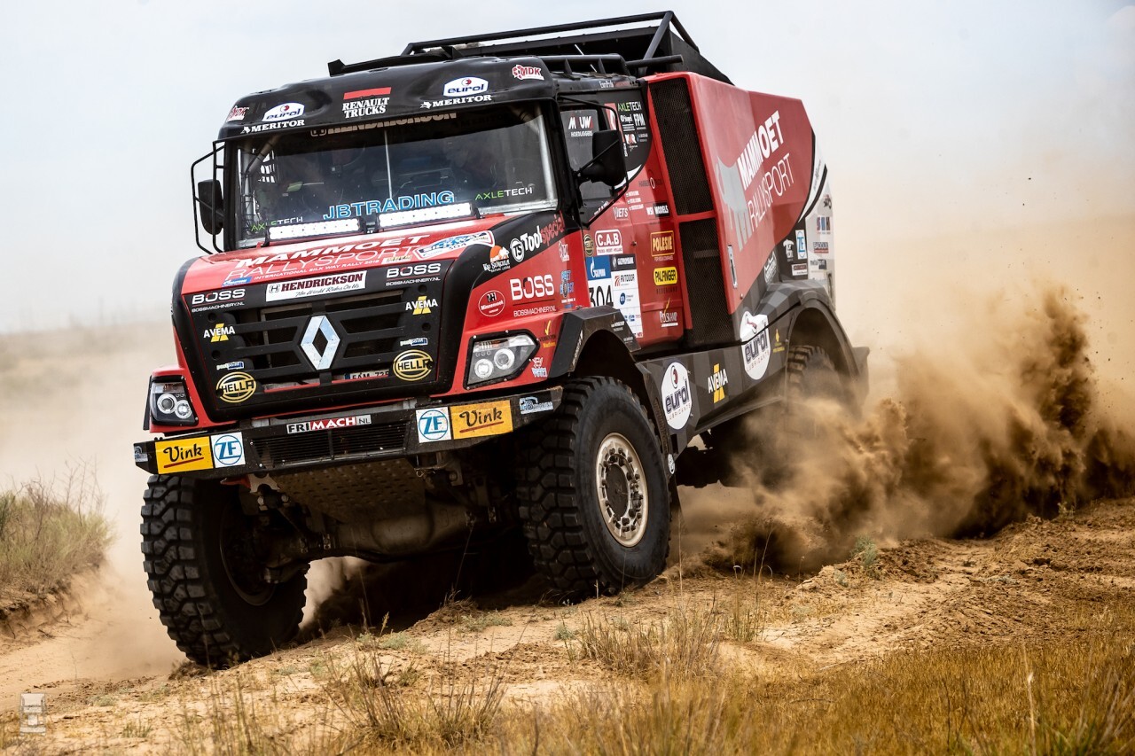 Het team van Mammoet Rallysport is onderweg in de Silk Way Rally, en dat gaat niet vanzelf. Meteen in de eerste etappe brak er een voorwiel van de Sherpa af en liep de brandstoftank leeg. Dat resulteerde in een maximale straftijd waarmee het klassement er nu al niet meer toe doet.