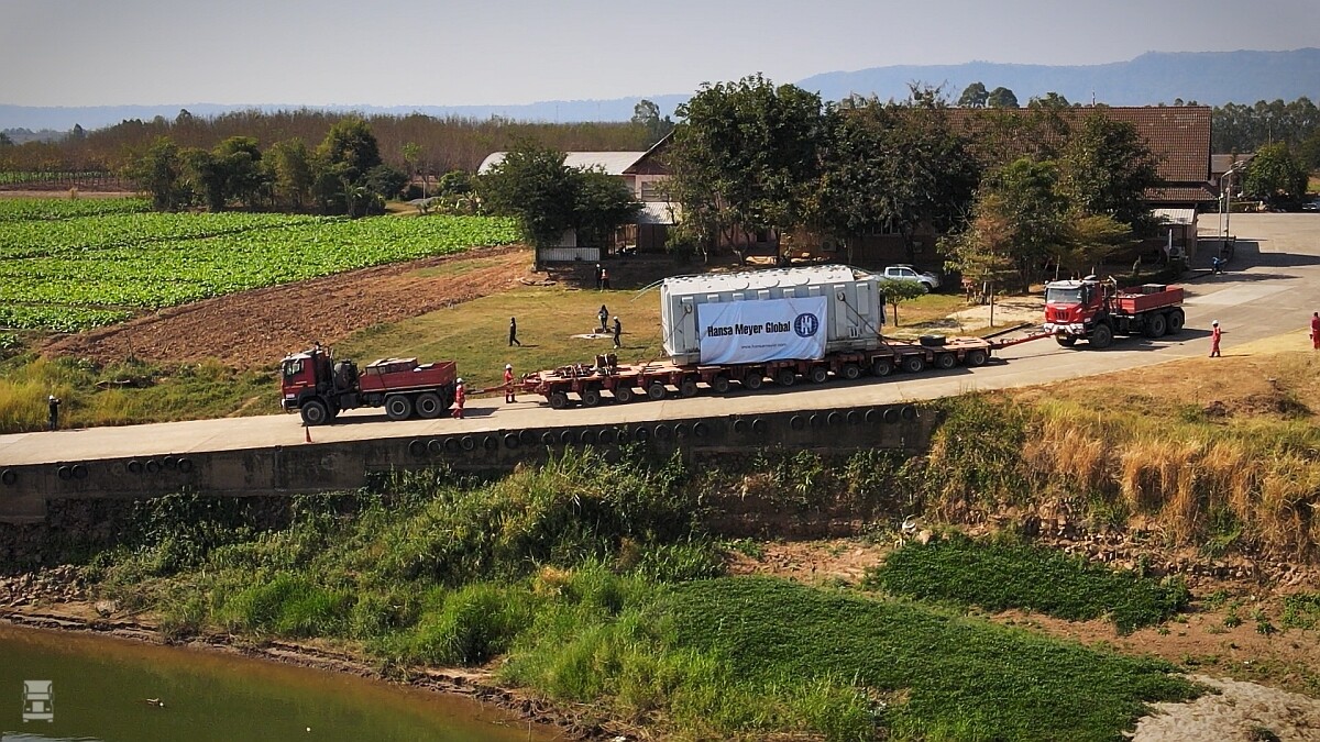 Daarbij reden de mannen van Mammoet en Hansa Meyer van Thailand naar Laos. Om dat te doen, moet je de Mekong-rivier oversteken. Het probleem daarbij was of die rivier wel diep genoeg zou zijn om de lading met aslijnen en zwaar transport trekkers te kunnen dragen zonder vast te lopen. Van die 1100 kilometer, neemt de oversteek maar 1100 meter in beslag, maar zoals chauffeurs in dit vak weten: elke meter is van belang. Door een speciaal vlot te construeren, wisten de specialisten van beide bedrijven de lading veilig naar de overkant te krijgen. Bekijk het filmpje hoe dat in zijn werk ging! Daar zie je ook dat er zwaar transport-trekkers van meerdere merken werden ingezet.
