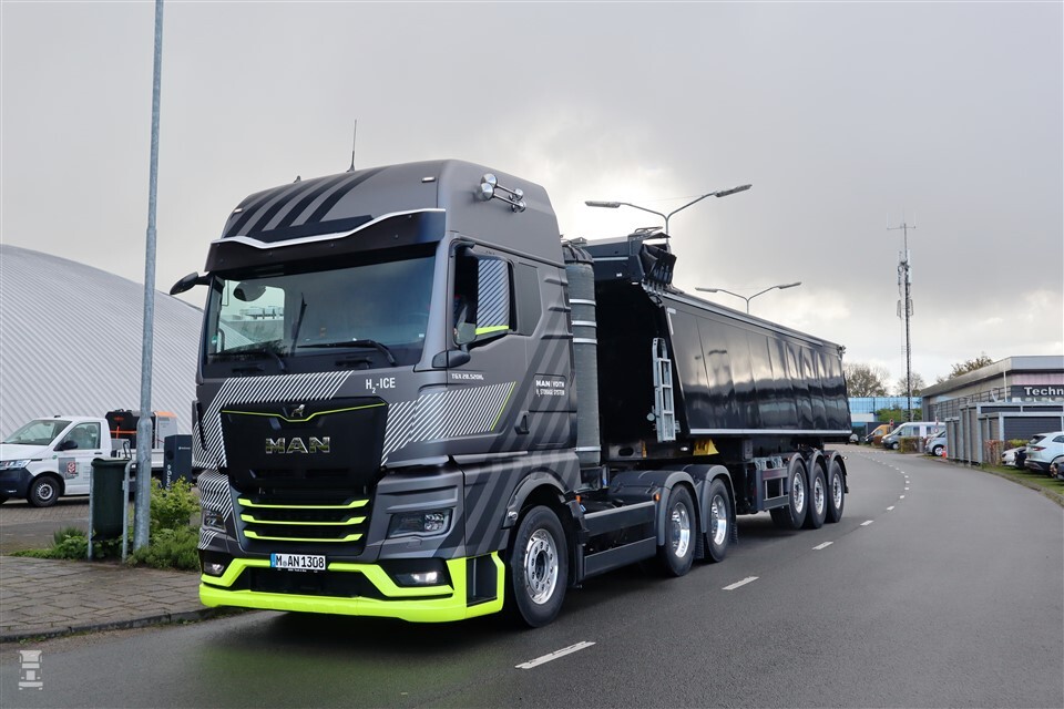 Op uitnodiging van MAN mochten wij als één van de eersten kennismaken met de MAN hTGX. De truck kwam net terug uit Zweden voor koudetests. Allerlei meetapparatuur zat nog op de truck en in het interieur was het een wirwar van kabels en computers. Desondanks mochten we er wel mee op pad, gekoppeld aan een kipperoplegger nog wel. We waren erg benieuwd hoe een verbrandingsmotor op waterstof klinkt en rijdt.