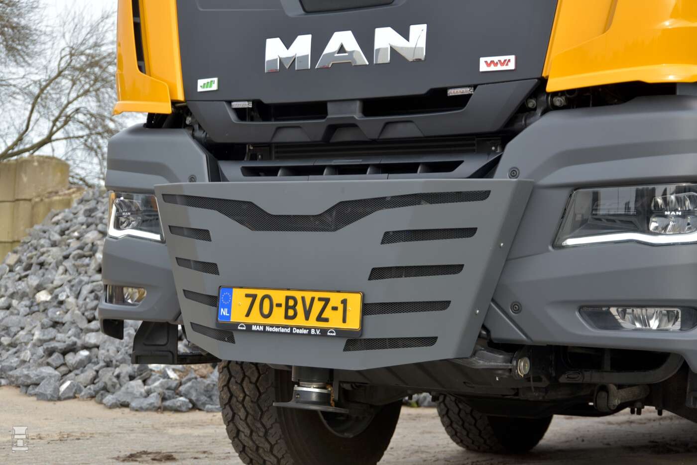 Verder is de truck af-fabriek (MAN Individual) geleverd met een steunpoot-voorbereiding aan de voorzijde om zwaar kraanwerk vóór de cabine mogelijk te maken. Het ijzersterke 9,5mm chassis levert deze draagkracht zonder de toepassing van extra inner-liners in het chassis. In dit geval betreft het de 13-tons uitvoering. MAN kan zelfs een 20 tons steunpoot voorbereiding af-fabriek leveren. Een unieke prestatie voor dit soort voertuigen.