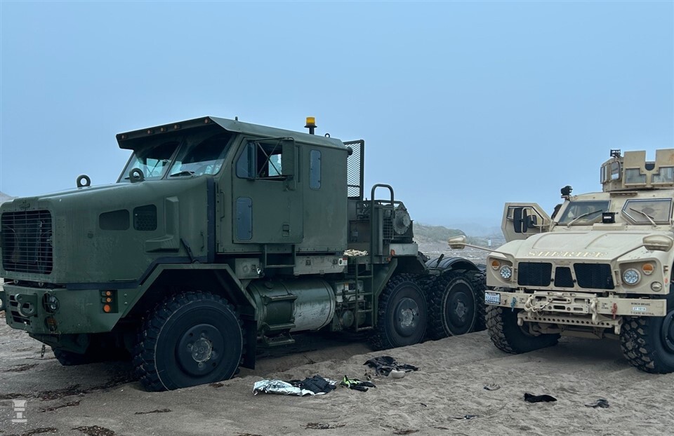 Bij de politie kwam een melding binnen van “het voorste deel van een militair-achtig voertuig” op een parkeerplaats. Agenten die kwamen kijken, vonden de gestolen Oshkosh. Bij het zien van de agenten ging de bestuurder er echter vandoor. Bij Oro State Park ramde de truck een hek en reed het strand op. Hier bleek de Oshkosh niet zo in zijn element: de trekker kwam vast te zitten in het rulle zand. Het stuk strand waar hij zich bevond, heet dan ook Sandspit Beach.