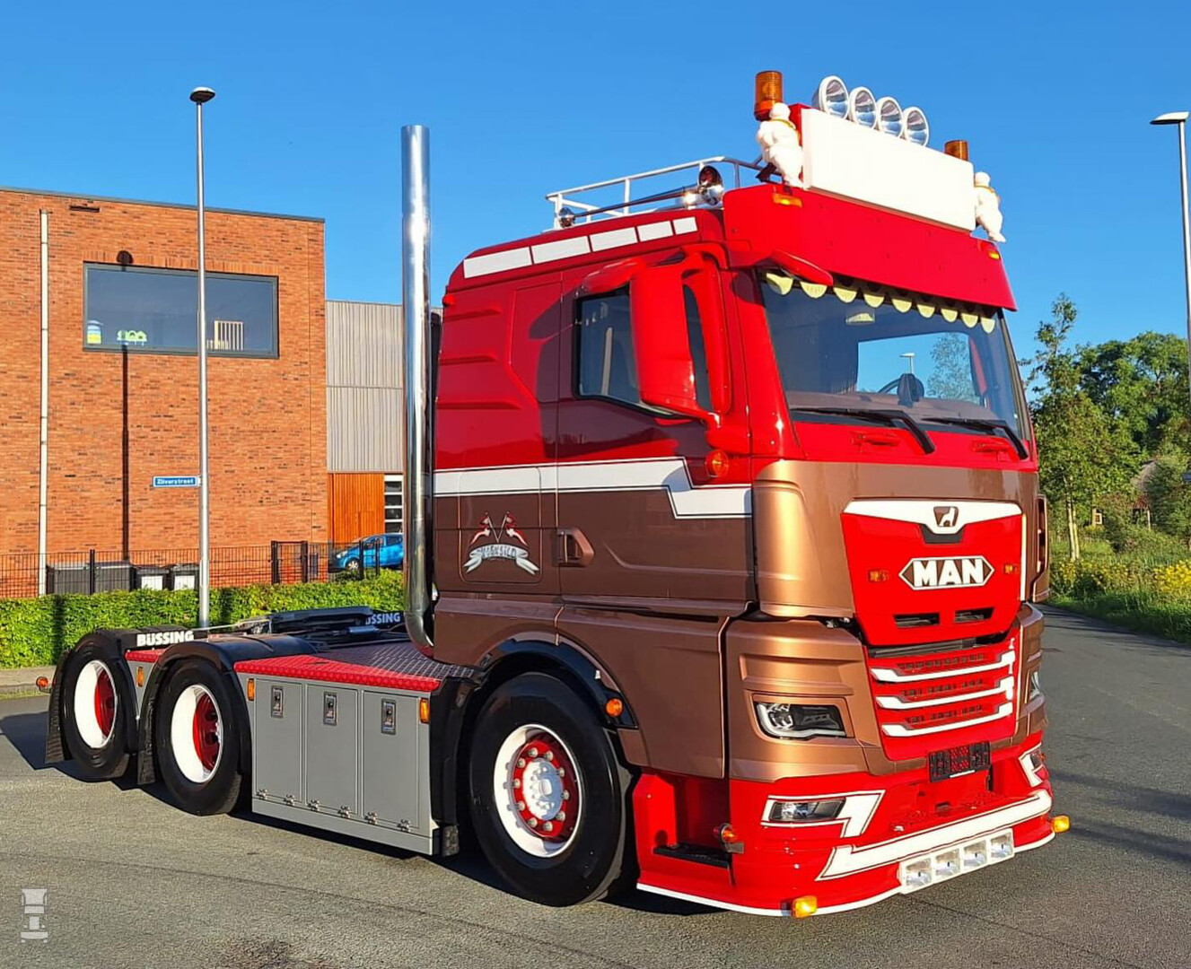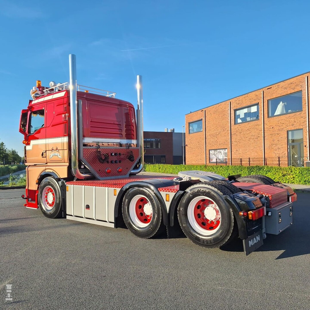 De MAN TGX 6x2 trekker met sleepas is nog niet helemaal af op de foto's, maar duidelijk is wel dat de kleuren hem erg goed staan. De trekker, met een laag dak, werd helemaal in de klassieke 'Oldskool' Ceusters style opgebouwd met staande pijpen achter de cabine, een stoere lichtbak met lampen en een verlengde zonneklep. De standaard zijskirts werden vervangen door fraaie 'Deense' kisten en een speciale zijskirt links met de uitstraling van een grote brandstoftank. Alles bij elkaar een plaatje en wij zijn benieuwd naar het eindresultaat.