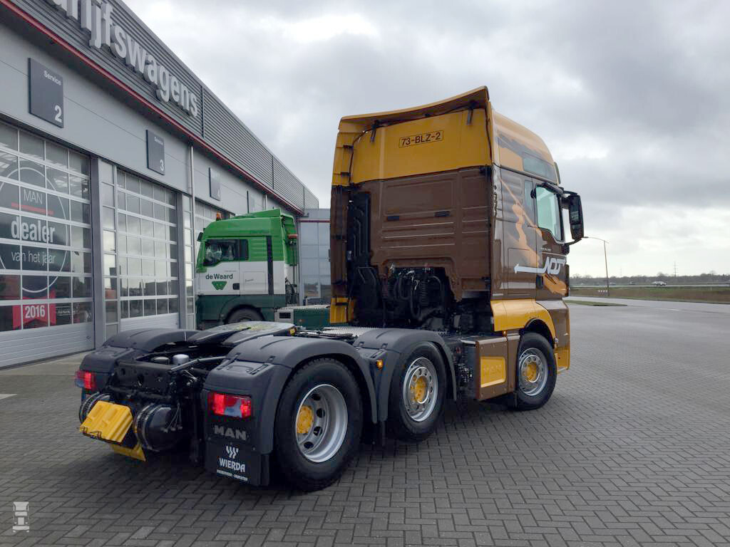 Twee van de drie MAN trekkers zijn 4x2 chassis, de derde is een 6x2 met voorloopas. Die drie asser is goedgekeurd voor LZV inzet, de andere twee zijn geleverd in ADR uitvoering. De bruin met gele kleuren staan bijzonder goed op de MAN trucks. Met de brede voorbanden, de lichtbak en de gesloten zijafscherming zijn het fraaie trucks om te zien. Niek Dijkstra vervoert containers en is actief op het gebied van tanktransporten. De eigen containerterminal in Heerenveen is de spil in het logistieke netwerk van veel in- en exporterende bedrijven in noord Nederland. De vloot van Niek Dijkstra bestond ooit vrijwel volledig uit Volvo's met een enkele Scania maar daarin is sinds de sterke expansie van het bedrijf verandering gekomen. Sindsdien rijden er ook DAF en Renault trucks en nu dus ook MAN's. De beide 4x2 trekkers werden door Wiegel Automotive voorzien van een blower voor bulktransporten. ASN Autoschade Vonk in Heerenveen tekende voor het spuitwerk. MAN dealer Wierda Bedrijfswagens leverdt de MAN trucks af.