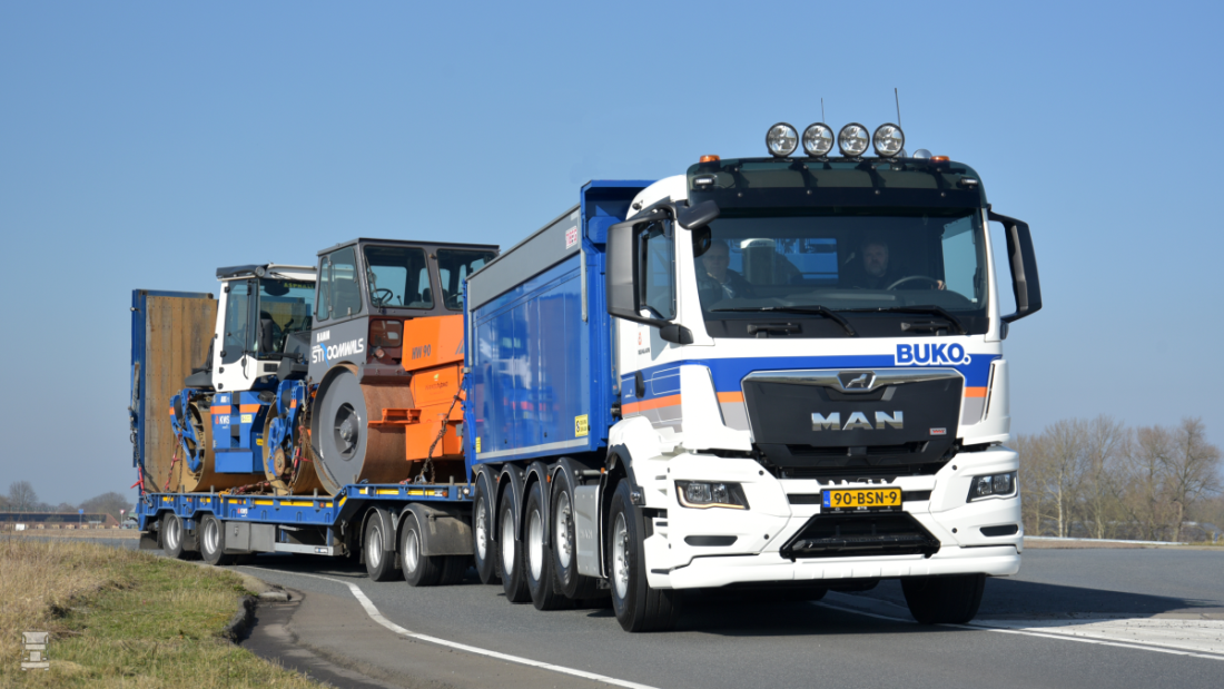 BUKO Transport uit Beverwijk heeft een regelrechte primeur in huis met de eerste MAN WVTetra, een compacte vijf-asser met een koppellengte van precies acht meter. Dankzij deze compacte afmeting past deze MAN-truck binnen de wettelijk toegestane lengte voor een gangbare dieplader-aanhangwagen. Bovendien is het een volwaardige 10x4 asfaltkipper met een laadvermogen van 31 ton.