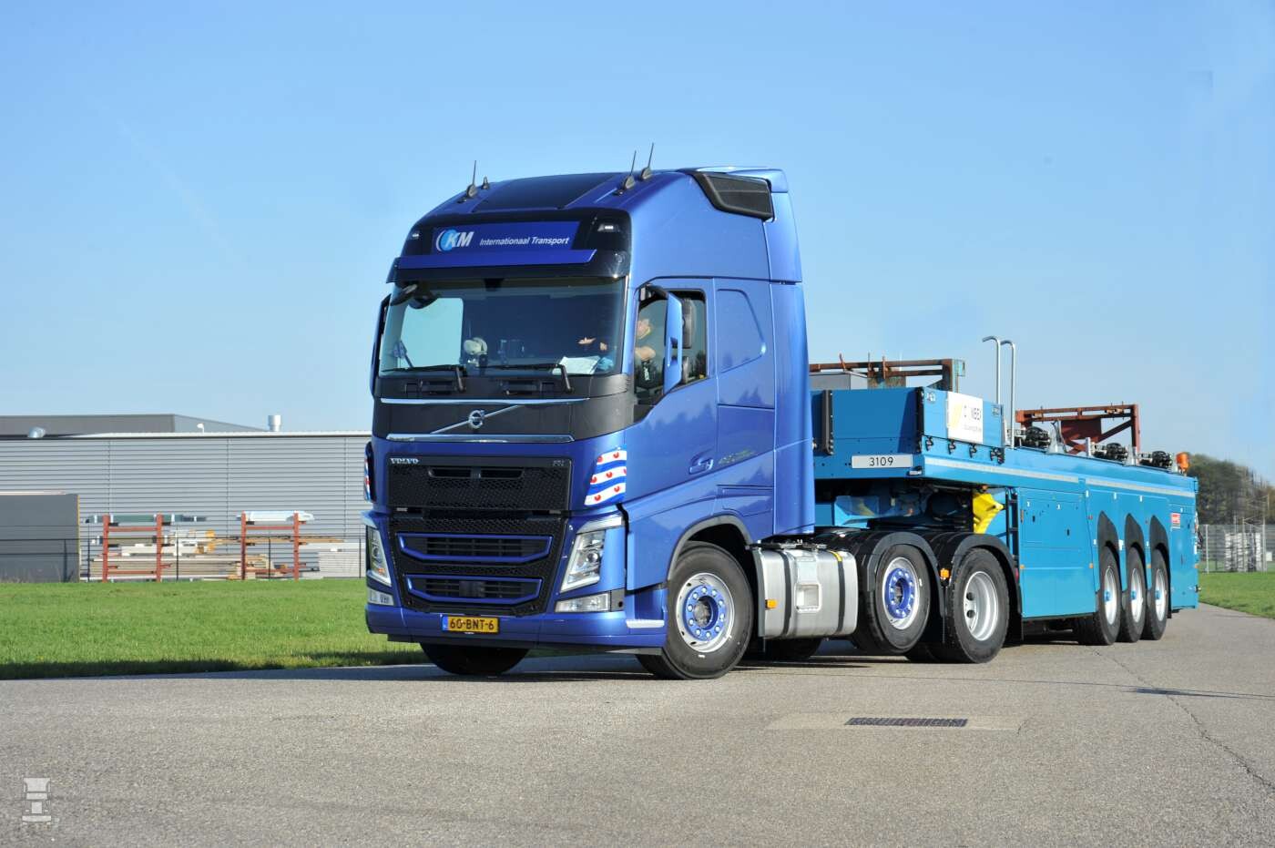 De Volvo FH460 I-Save is uitgevoerd als 6x2 voorloopas trekker met rondom luchtvering en een Globetrotter XL cabine. De trekker is uitgerust met een PTO en een hydrauliek set, een AdBlue tank achter de cabine en de accu’s achter in het chassis. Dankzij die slimme opbouw bleef er ruimte voor 550 liter brandstof in de standaard Volvo tanks. Mark rijdt voornamelijk binnen Nederland in opdracht voor Combex Bouwlogistiek met een Langendorf binnenlader. Daarmee worden sledes met prefab betonelementen voor de bouw geladen. De bodemloze oplegger rijdt om zo’n slede heen waarna de hydrauliek het geheel omhoog lift. Op deze manier kunnen ook hoge elementen zoals complete wanden tot bijna vier meter hoogte vervoerd worden.