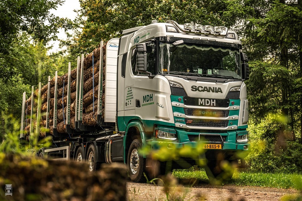 MDH Rondhout heeft zeven machines die in één keer bomen kunnen opzagen, strippen, inkorten en stapelen. De boomstammen worden vervolgens naar een bosweg gebracht. De Scania, één van de tien trucks van het bedrijf, wordt ingezet om hout uit het bos te rijden. Om te voorkomen dat de Scania zich hier vast rijdt, is hij voorzien van een mechanisch inschakelbare voorwielaandrijving.