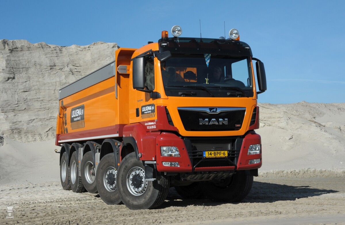 De grote wendbaarheid is belangrijk voor Lolkema aangezien het bedrijf de trucks veelzijdig inzet. Bij grote zandleveranties vanuit de eigen zandwinning worden de trucks ingezet in het zware werk in de zandbanen, maar in de bouw moet er soms op de centimeter gemanoeuvreerd worden. Juist dan is de compacte bouw een pre. Dat werd mogelijk door de uiterst compacte MAN uitlaatdemper tussen as een en twee. Het roetfilter deel zit tussen de assen en de SCR-katalysator staat achter de cabine. De nieuwe MAN trucks zijn voorzien van een 23 kuubs Vossebelt kipperopbouw. Beide trucks zijn inmiddels al enige tijd in gebruik tot grote tevredenheid van de chauffeurs. Met name het comfort in de ruime MAN cabine wordt gewaardeerd, maar ook het rijcomfort en het bedieningsgemak scoren hoge ogen. De trucks zijn voorzien van de 12,4 liter MAN D26 krachtbron met 460 pk in combinatie met de MAN TipMatic versnellingsbak met speciale offroad software.