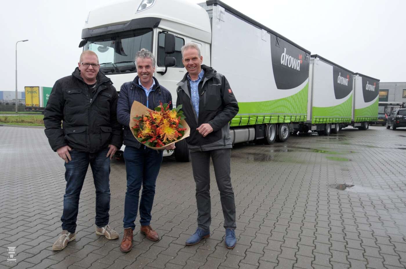 Op de foto zie je VLNR chauffeur Bert Allema, Heine de Vries van BSF en Drowa directeur Kees de Vries.