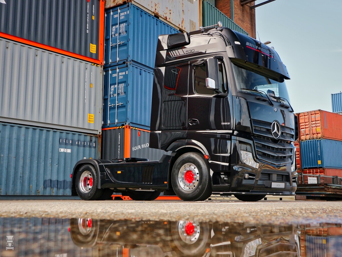 Opvallend aan de Actros van Mercedes Maasdijk is verder dat het een 1853 betreft met een groot aantal extra's die deze Actros beslist een stoere, eigen look geven. Niet zichtbaar is de luchtgeveerde vooras en de 'lowbar' maakt het geheel natuurlijk stijlvol af.