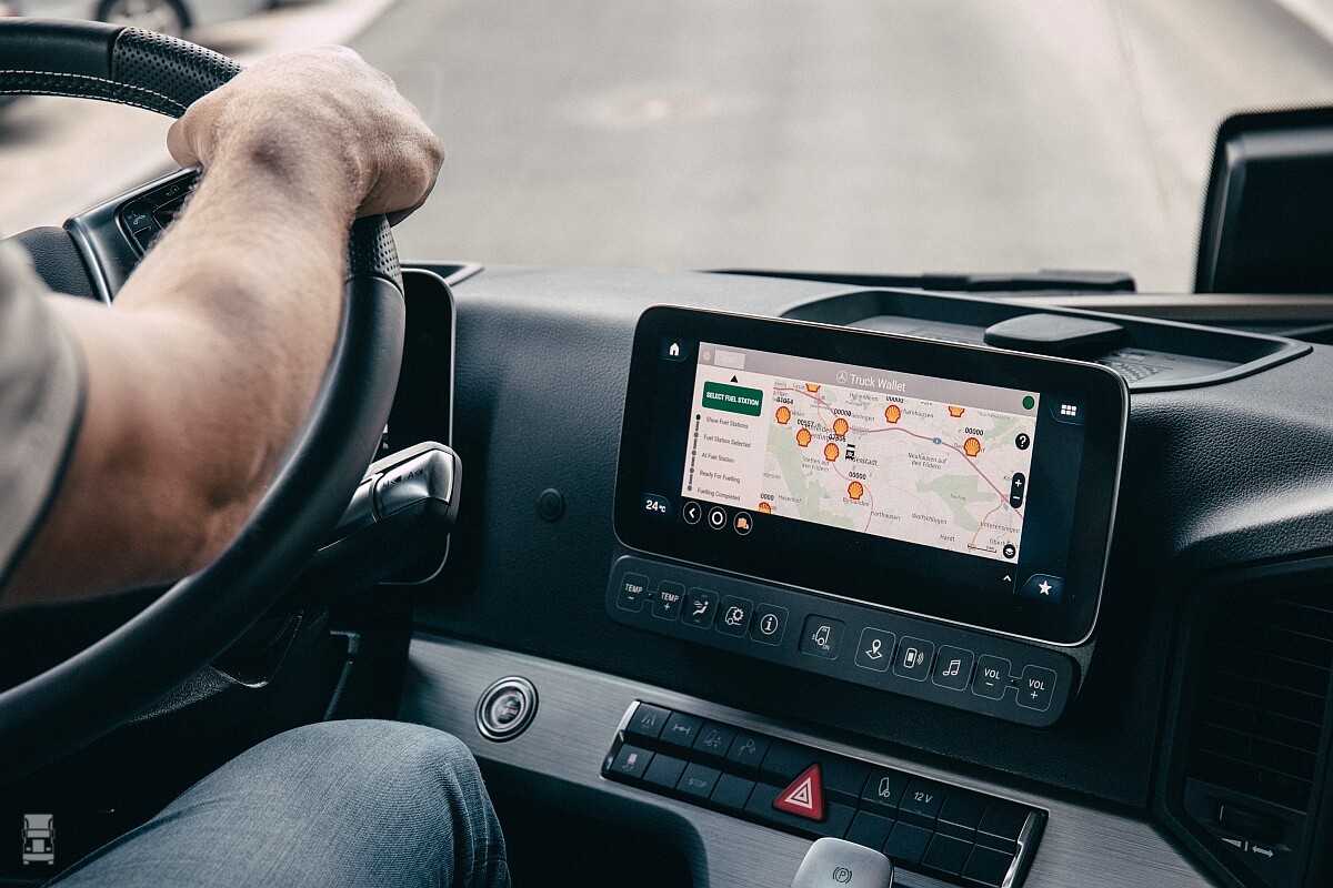 Specialisten van Mercedes en Shell hebben daarvoor een nieuw prototype van de digitale Truck-ID in combinatie met een zogeheten digitale tankpas in de boordcomputer geïnstalleerd. De Truck-ID fungeert als een geïntegreerde ID-kaart, dus de transacties worden uniek toegewezen aan jouw Actros en automatisch ondertekend door de truck zelf.