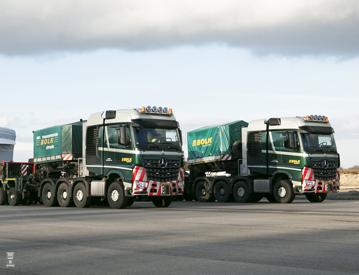 De Arocs trekkers zijn geschikt voor het trekken- of duwen van ladingen tot 250 ton. Verder maken speciale banden en de bladvering het mogelijk om de zware windturbinecomponenten ook bij een hellingsgraad van 14-18%, zoals bij het op- en afrijden van dijken, te kunnen transporteren. Joop Savenije, commercieel en operationeel directeur van Bolk Transport, vertelt: “Met de Turbo-Retarder-Koppeling kunnen we op de centimeter nauwkeurig manoeuvreren met ladingen van 150 à 200 ton, zonder dat dit voor schadelijke verhitting of slijtage zorgt. Met name op de locaties waar we de windturbinecomponenten afleveren is vaak weinig ruimte waardoor veel kleine manoeuvres gewenst zijn.”