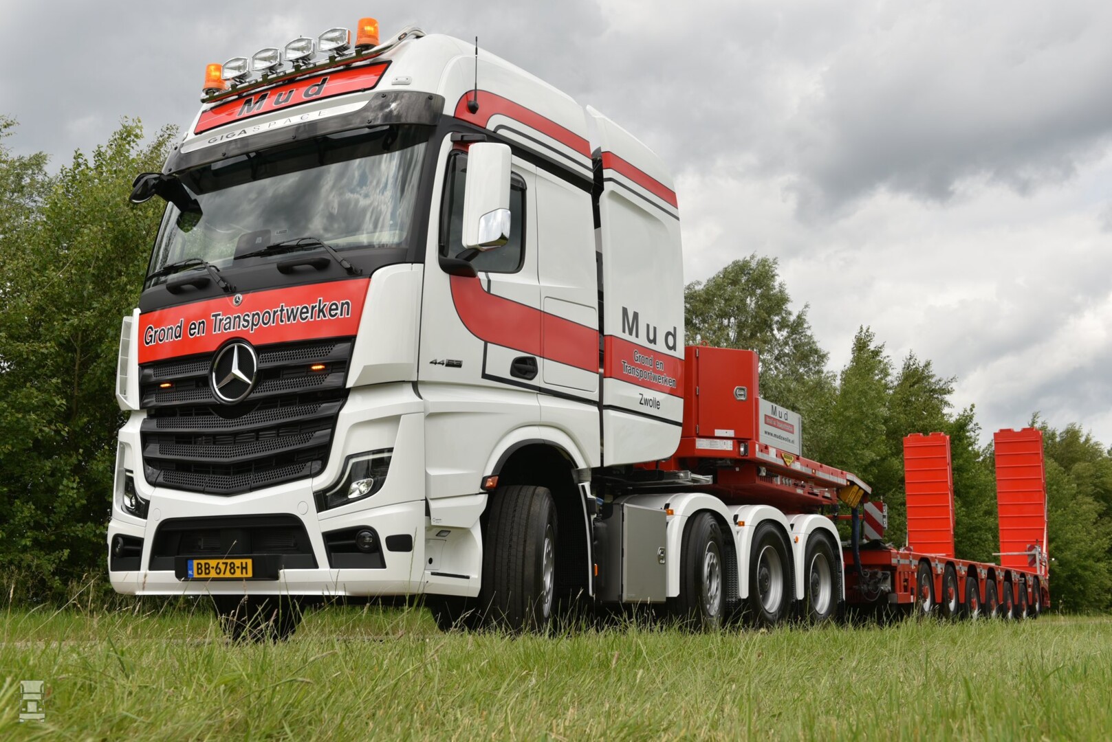 De truck werd door dealer Wensink voorzien van een omvormer met magnetron, een Kelsa beugel met verstralers en zwaailampen en flitsers in de grille. Mud zet de truck in voor het transport van grondverzetmachines door heel Nederland. Achter de stoere trekker zien we een Broshuis semi dieplader met zeven aslijnen pendelassen.