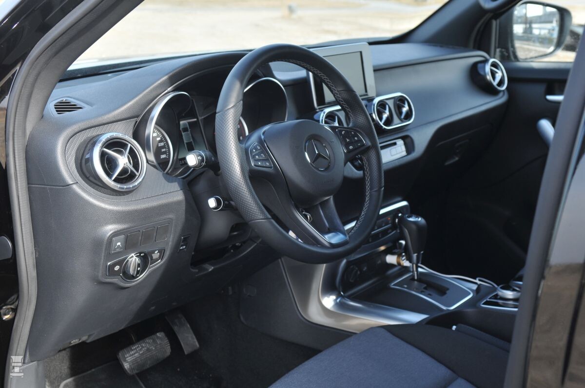 Duidelijk onderscheidend in pick-up land is de fijne zeventraps automaat, die Mercedes ook in de V-klasse monteert. De motor blijft altijd rustig, maar trekt lekker door. Toch kunnen we de X-klasse met zijn leeggewicht van twee ton niet echt snel noemen. Wie dat wil, moet nog even wachten op de 258 pk sterke V6. Maar in het dagelijkse verkeer kan de X-klasse prima meekomen. De scheidingswand in het interieur laat voldoende ruimte om de stoel te verstellen, ook voor langere personen. Het Mercedes dashboard, je zou haast zeggen commandocentrum, werkt erg makkelijk, navigatie en andere zaken zijn eenvoudig in te stellen en zelfs in te spreken. Allemaal comfort uit duurdere personenwagens, waar je als pick-up rijder heel snel aan kunt wennen!
