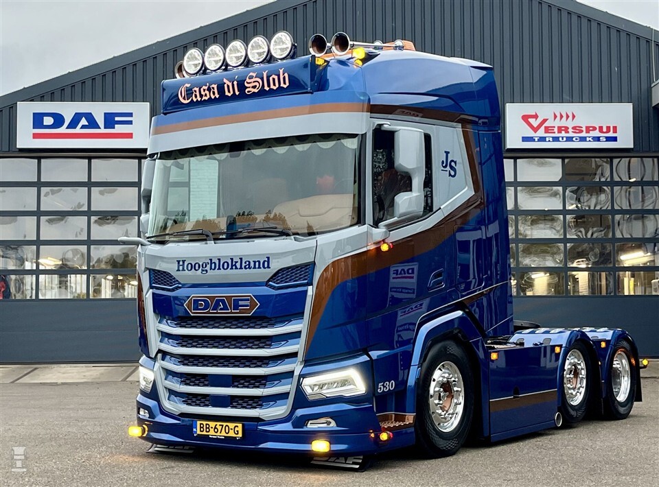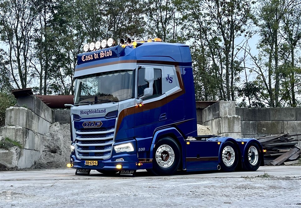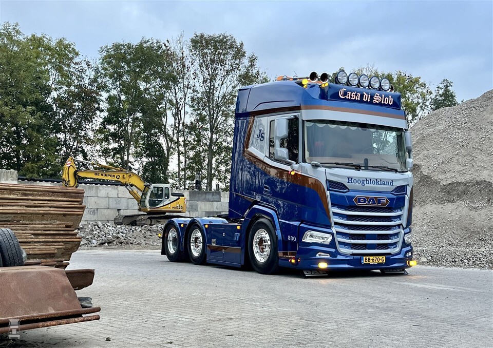 De Scania R500 van Jurgen Slob gaat met pensioen. Hij blijft in het wagenpark, maar hij mag wat rustiger aan gaan doen. Zijn dagelijkse taken worden overgenomen door een nieuwe DAF XF 530 FTG. Niet alleen in vermogen is dit een upgrade, maar zeker ook qua looks. De blauwe basiskleur van het bedrijf is gebleven, maar aangevuld met een licht blauwgrijs en een chique bronskleur. Deze DAF XF is met recht een pareltje te noemen.