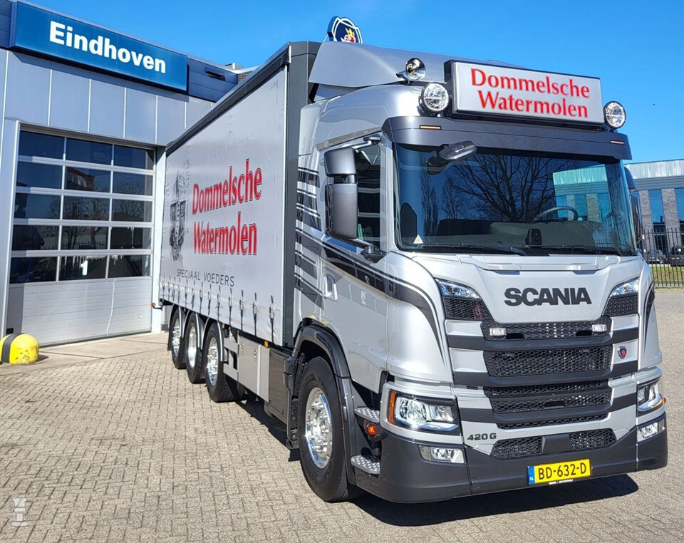 Een watermolen is een eeuwenoude, bewezen techniek voor het malen van granen en diervoeders. Voor het transport van de eindproducten is oude techniek wat minder handig. Daarom zet de Dommelsche Watermolen nu een nieuwe Scania 420G in. De vierassige bakwagen is geheel bij de tijd. Onder de verlengde dagcabine ligt de zuinige Super-motor. De Scania is volledig luchtgeveerd. Zowel de eerste als de laatste as van het tridem-stel zijn liftbaar en gestuurd.