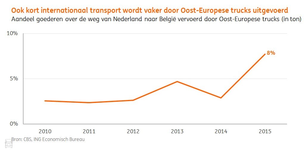 Volgend op de rapportages van het CBS, de voorstellen van de Europese Commissie inzake het wegvervoer en de tevredenheid bij TLN, komen de economen van ING met een interessante aanvulling die laat zien dat vervoerders uit Midden- en Oost-Europa (MOE) marktaandeel winnen op ritten van Nederland naar België. Van een procent of vijf, stijgt hun marktaandeel in korte tijd naar acht procent.