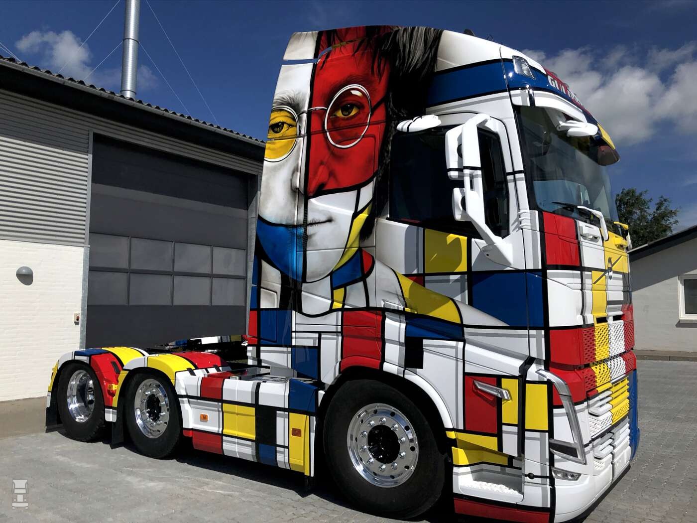 Guldager heeft een nauwe relatie met Volvo Trucks en het is dan ook geen toeval dat hij nu al een nieuwe FH truck in zijn bezit heeft. Net als in 2013, toen hij een Volvo in de wilde kleuren naar een ontwerp van de Spaanse kunstenaar Joan Miró liet spuiten wilde hij ook deze keer een artistiek thema voor de truck. De keuze viel deze keer op een ontwerp wat geïnspireerd is op de Nederlandse kunstenaar Piet Mondriaan in combinatie met een portret van John Lennon. Van die laatste is ook het thema 'Give peace a chance' geleend, compleet met een 'Peace' teken op de opleggerschotel. Om het helemaal af te maken voegde artiest Ray Hill een banaan toe die hij op de achterwand van de cabine aanbracht. Die banaan is geïnspireerd op een kunstwerk van de Italiaanse kunstenaar Maurizio Cattelan. Het origineel van dat werk werd vorig jaar geveild in Miami voor 120.000 Dollar!